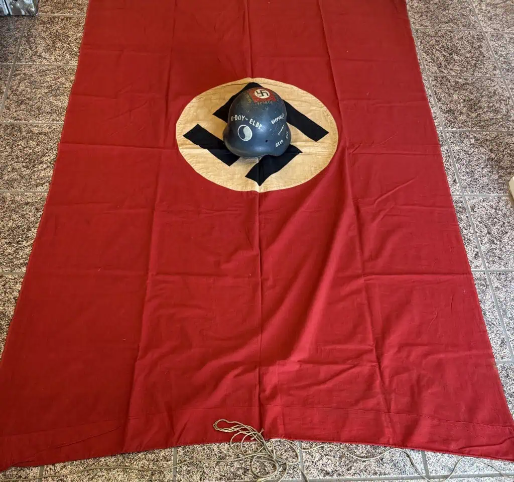 Original WWII Era German Nazi Party Flag Certified. A standard style Cloth banner type flag. Utilized by pretty much by all the organization of the Third Reich in one form or another. The swastika, (a Sanskrit word meaning “well-being”), is an ancient symbol that was utilized in numerous diverse cultures and signified both the cycle of life and the sun. The swastika was also a Nordic rune and the pagan Germanic symbol for Thor, God of Adventurers. In good but used condition double sided 52″/80″! We placed a helmet on one photo for a size reference. standard cotton bunting style material with screened white disk and multi-piece swastika. A fantastic piece of WWII history. This flag is A standard quality version and one of the better displayable sizes for the most discriminating and cultivated collector. Even with the minor condition issues it Overall a very collectible flag with lots of history. Nice period used flag captured by a U.S. Veteran and brought home as a war trophy. Nice used example showing the expected age. 100% Guaranteed to be authentic Brought home by a solider as a trophy of war. A very desirable size Don’t miss this one! RARE in this size. Complete museum documentation (COA) Provided. Certified by The Gettysburg Museum of History. The Gettysburg Museum of History does not support or condone Adolf Hitler or the Nazi Party and is only offering this as a historic relic. Please see our other items. Also note when browsing our web site there are several pages of items, at the bottom of the list look for other page numbers. RARE IN THIS SIZE. Good EXAMPLE! NSDAP FLAGS ARE GETTING TOUGHER TO FIND! Don’t Miss It!!!! RARE, good Condition (see photos) A few small spots on one side only.