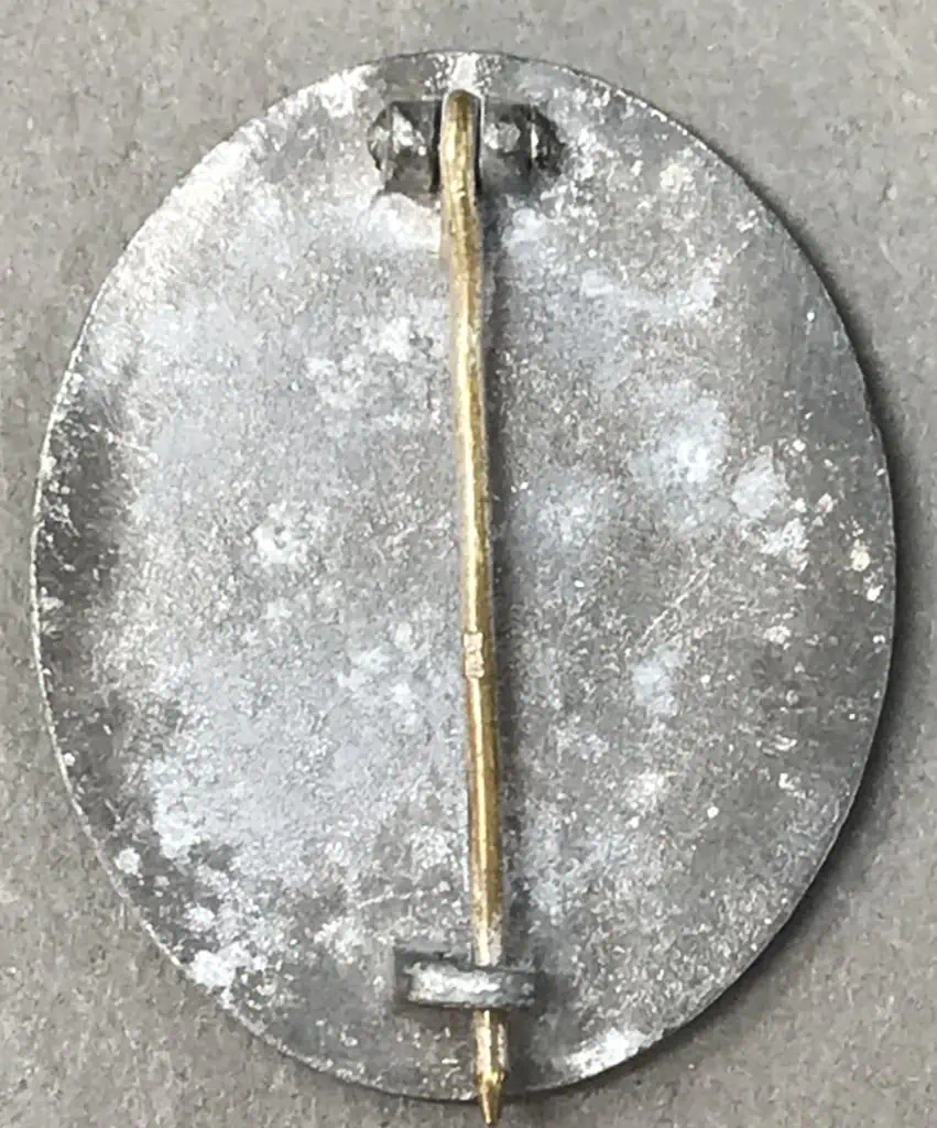 Original 1939 pattern, die struck, alloy construction, solid backed badge with a silver wash. The silver badge is higher award than the black. The badge was instituted in three classes, of black, silver and gold with the class bestowed reflecting the number or severity of the wounds received. The badge is in the form of an embossed, vertically oval, laurel leaf wreath encompassing an embossed profile of a M35 pattern helmet with a high relief, canted, swastika to the center, superimposed over crossed swords on a pebbled base field. Complete pin and catch assembly. Brought home by a U.S. Veteran as a war trophy. Some wear and toning from use with storage wear and loss to the silver wash. An honest untouched U.S. Veteran bring back German medal. 100% guaranteed to be authentic. Gettysburg Museum Of History Certified (COA) provided. Please see our other versions of wound badges on our web site. Nice BADGE!