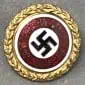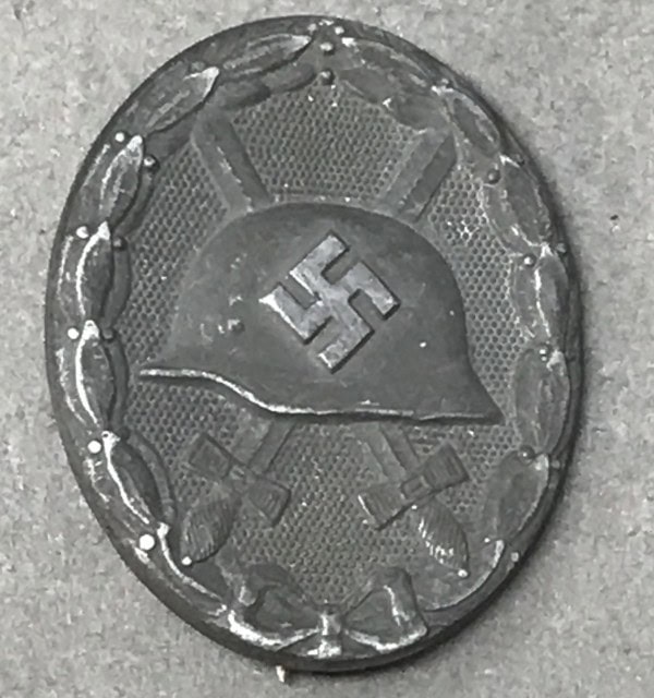 Original 1939 pattern, die struck, alloy construction, solid backed badge with a silver wash. The silver badge is higher award than the black. The badge was instituted in three classes, of black, silver and gold with the class bestowed reflecting the number or severity of the wounds received. The badge is in the form of an embossed, vertically oval, laurel leaf wreath encompassing an embossed profile of a M35 pattern helmet with a high relief, canted, swastika to the center, superimposed over crossed swords on a pebbled base field. Complete pin and catch assembly catch  still work fine.   Brought home by a U.S. Veteran as a war trophy.   Some wear and toning from use with  storage wear and loss to the silver wash.  A nice untouched U.S. Veteran bring back German medal. 100% guaranteed to be authentic. Gettysburg Museum Of History Certified (COA) provided. Please see our other versions of wound badges on our web site.  Nice BADGE!