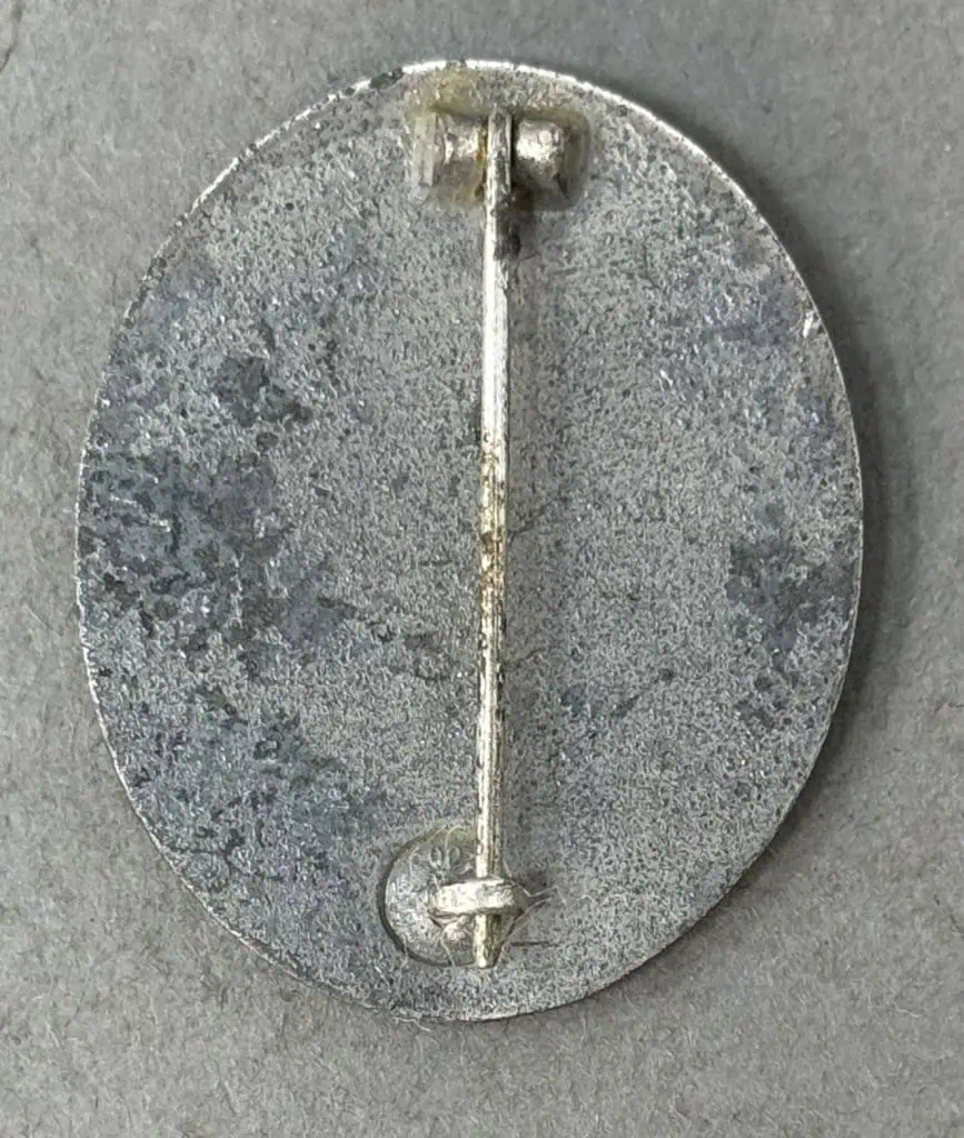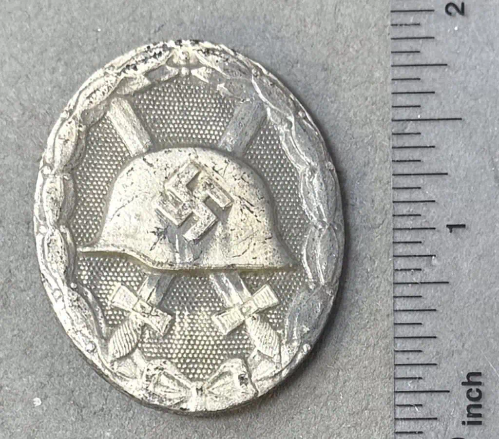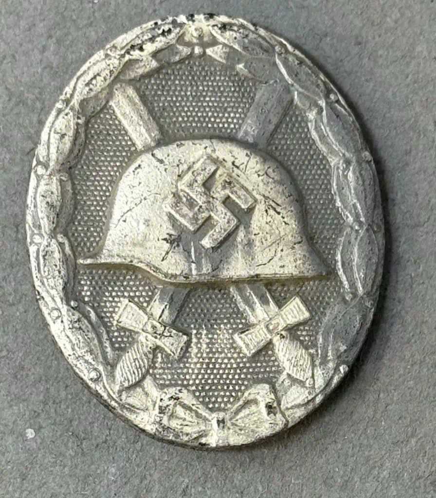 Original 1939 pattern, die struck, alloy construction, solid backed badge with a silver wash. The silver badge is higher award than the black. The badge was instituted in three classes, of black, silver and gold with the class bestowed reflecting the number or severity of the wounds received. The badge is in the form of an embossed, vertically oval, laurel leaf wreath encompassing an embossed profile of a M35 pattern helmet with a high relief, canted, swastika to the center, superimposed over crossed swords on a pebbled base field. Complete pin and catch assembly catch still work fine. Some wear and toning from use with storage wear and loss to the silver wash. A nice untouched U.S. Veteran bring back German medal. 100% guaranteed to be authentic. Gettysburg Museum Of History Certified (COA) provided. Please see our other versions of wound badges on our web site. Nice BADGE!