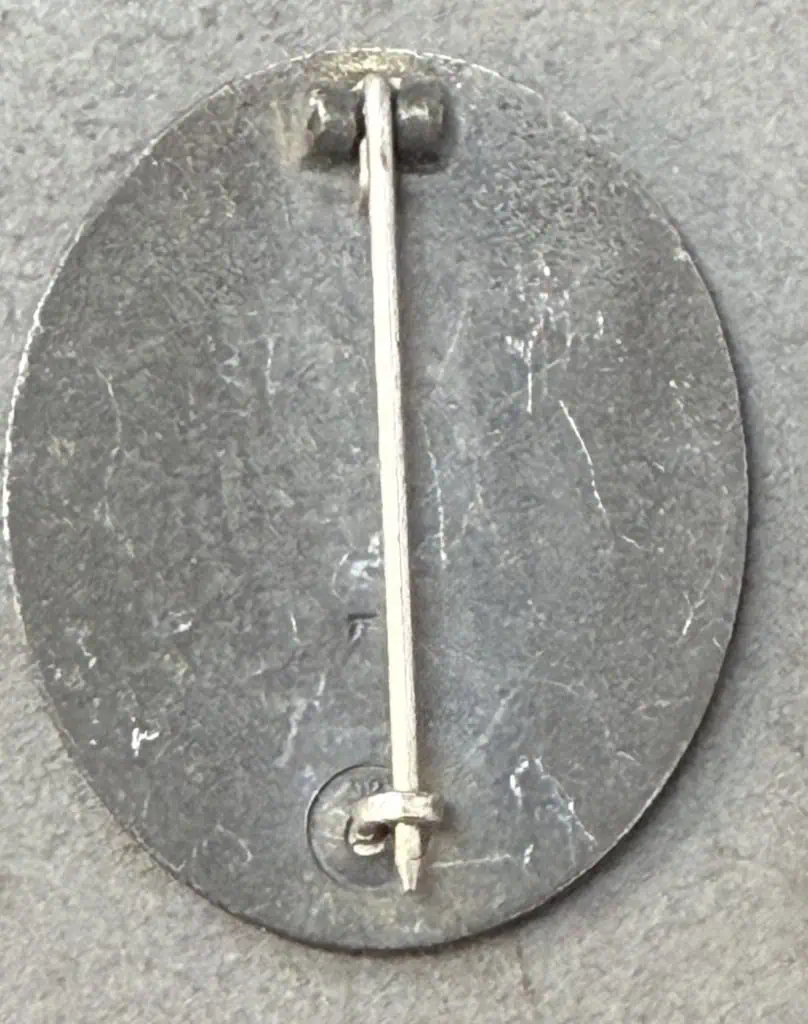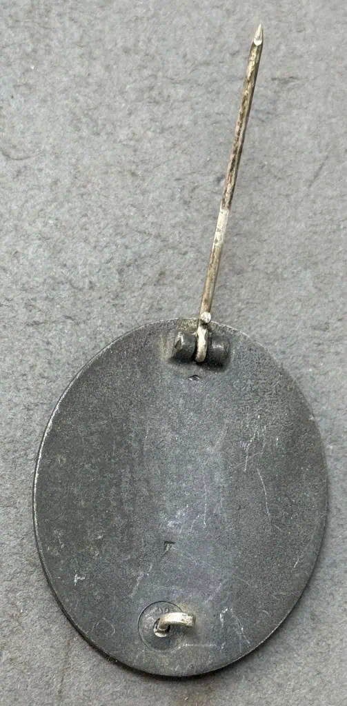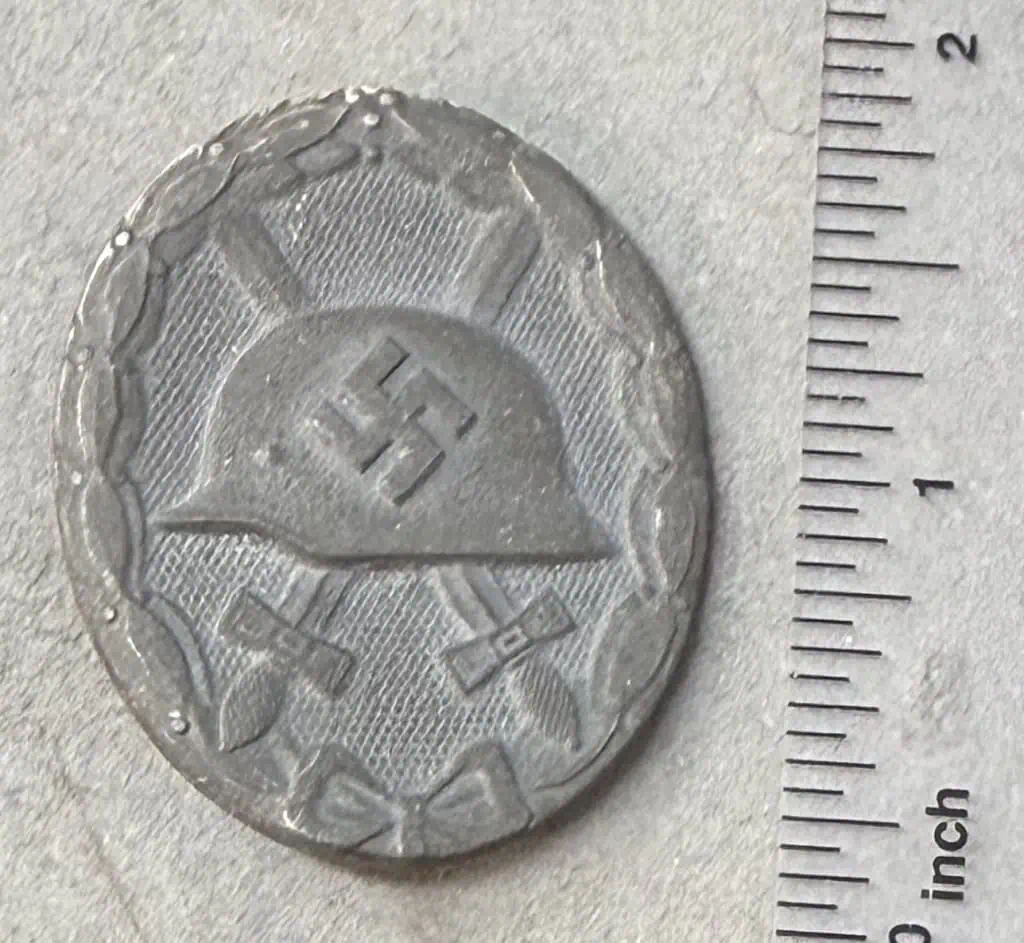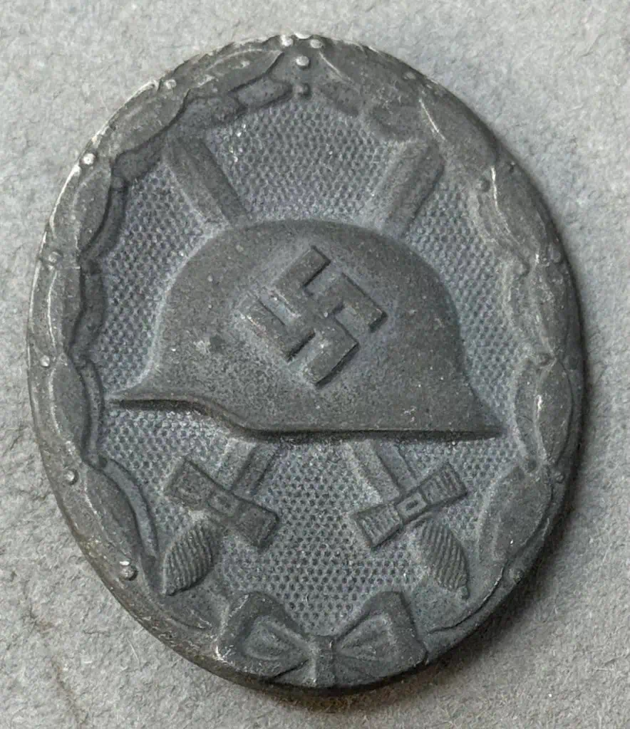 Original 1939 pattern, die struck, alloy construction, solid backed badge with a silver wash. The silver badge is higher award than the black. The badge was instituted in three classes, of black, silver and gold with the class bestowed reflecting the number or severity of the wounds received. The badge is in the form of an embossed, vertically oval, laurel leaf wreath encompassing an embossed profile of a M35 pattern helmet with a high relief, canted, swastika to the center, superimposed over crossed swords on a pebbled base field. Complete pin and catch assembly catch  still work fine.   Some wear and toning from use with  storage wear and loss to the silver wash.  A nice untouched U.S. Veteran bring back German medal. 100% guaranteed to be authentic. Gettysburg Museum Of History Certified (COA) provided. Please see our other versions of wound badges on our web site.  Nice BADGE! Nicely Maker Marked!