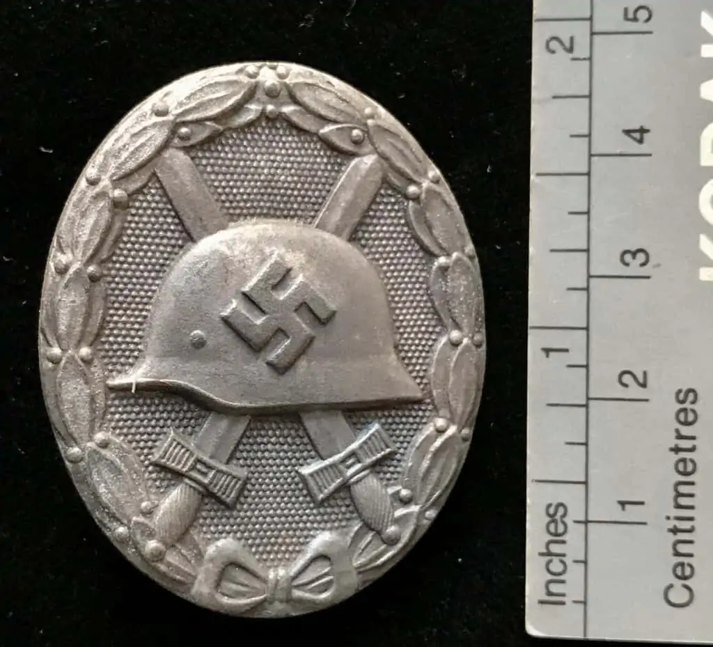 Original 1939 pattern, die struck, alloy construction, solid backed badge with a silver wash. The silver badge is higher award than the black. The badge was instituted in three classes, of black, silver and gold with the class bestowed reflecting the number or severity of the wounds received. The badge is in the form of an embossed, vertically oval, laurel leaf wreath encompassing an embossed profile of a M35 pattern helmet with a high relief, canted, swastika to the center, superimposed over crossed swords on a pebbled base field. Complete pin and catch assembly. Brought home by a U.S. Veteran as a war trophy. Some wear from use otherwise in good condition with minor storage wear and loss to the silver wash. maker mark number L22 for maker Rudolf Suval Vienna . An honest untouched U.S. Veteran bring back German medal. 100% guaranteed to be authentic. Gettysburg Museum Of History Certified (COA) provided. Please see our other versions of wound badges on our web site. VERY NICE BADGE!