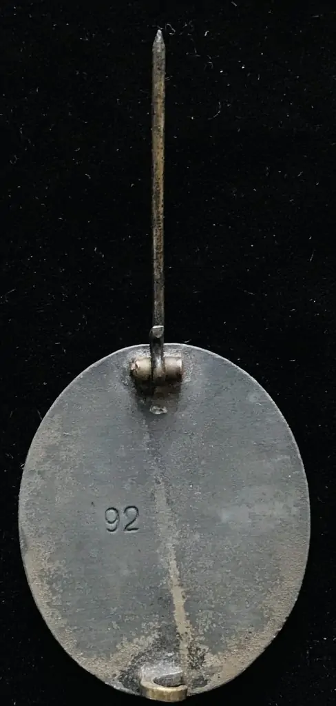 Original 1939 pattern, die struck, alloy construction, solid backed badge with a silver wash. The silver badge is higher award than the black. The badge was instituted in three classes, of black, silver and gold with the class bestowed reflecting the number or severity of the wounds received. The badge is in the form of an embossed, vertically oval, laurel leaf wreath encompassing an embossed profile of a M35 pattern helmet with a high relief, canted, swastika to the center, superimposed over crossed swords on a pebbled base field. Complete pin and catch assembly. Brought home by a U.S. Veteran as a war trophy. Some wear from use otherwise in good condition with minor storage wear and loss slight pitting and loss to the silver wash. maker mark number 92 for maker Josef Ruckert & Sohn . An honest untouched U.S. Veteran bring back German medal. 100% guaranteed to be authentic. Gettysburg Museum Of History Certified (COA) provided. Please see our other versions of wound badges on our web site.