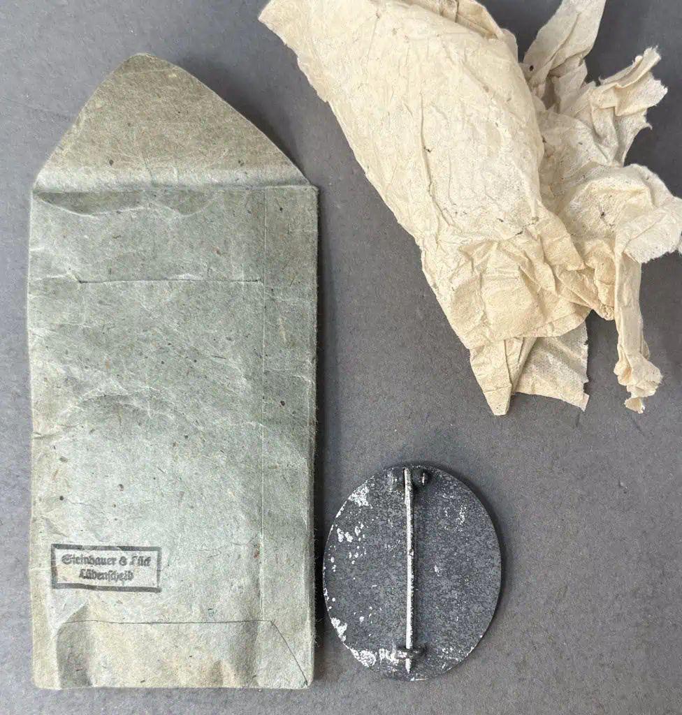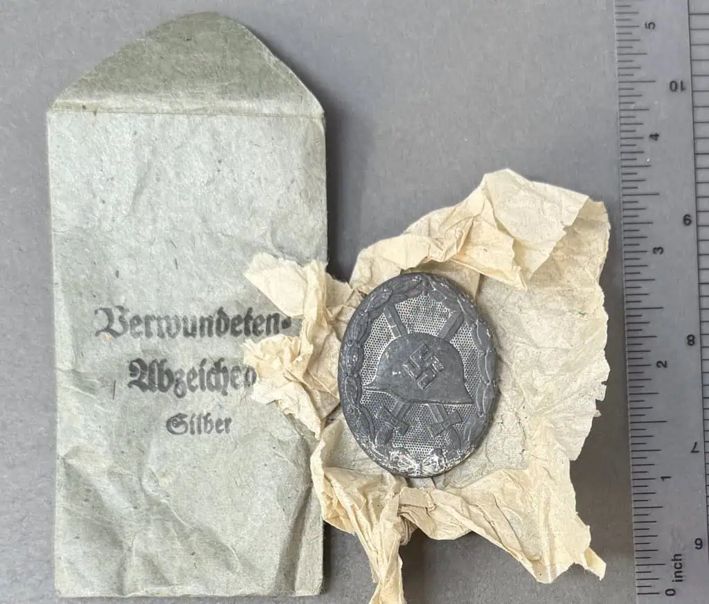 Original 1939 pattern, die struck, alloy construction, solid backed badge with a silver wash. The silver badge is higher award than the black. The badge was instituted in three classes of black, silver and gold with the class bestowed reflecting the number or severity of the wounds received. The badge is in the form of an embossed, vertically oval, laurel leaf wreath encompassing an embossed profile of a M35 pattern helmet with a high relief, canted, swastika to the center, superimposed over crossed swords on a pebbled base field. Complete pin and catch assembly. Brought home by a U.S. Veteran as a war trophy. Some wear and toning from use with storage wear and loss to the silver wash. 100% guaranteed to be authentic. Gettysburg Museum Of History Certified (COA) provided. Please see our other versions of wound badges on our web site. Catch is pushed down from storage WITH VERY RARE ORIGINAL ISSUE ENVELOPE WITH MAKER! NICE BADGE! From a recent Veteran group we obtained.