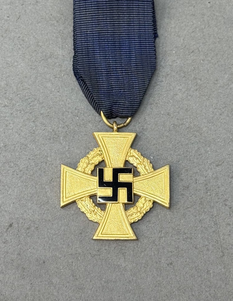 Original WWII German 40 Year FAITHFUL SERVICE Medal Certified. On January 30th, 1938, Hitler instituted the Faithful Service Decoration, in three classes, to recognize long-serving civil servants and public works personnel. The decorations were intended to be an incentive for the civilian population to foster workplace loyalty and create a stable civil service. A second class, die struck alloy decoration with gold wash   plated highlights, a frosted gold finish and a black enamel swastika. The decoration is in the form of a cross Pattée with a circular oak-leaf wreath extending between the arms of the cross. The center of the cross has a square plate with a black enameled static swastika to the obverse, and the embossed Gothic script to the reverse, “Für treue Dienste” (For Loyal Service). The arms of the cross have a slightly textured background field with a smooth, dual stepped, raised outer edge. Complete with original ribbon and pinback devise. Slight age toning and some storage wear but good CONDTION.  A very nice example.  Gettysburg Museum Certified (COA) provided. Rare 100% Guaranteed to be authentic. Sold for historic purposes only. See our other pieces on our web site. Also note when browsing our web site there are several pages of items, at the bottom of the list look for other page numbers. A rare artifact.