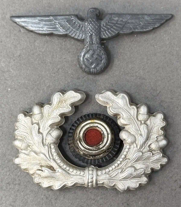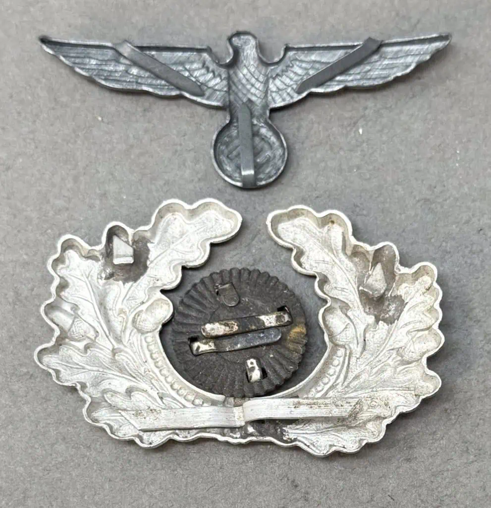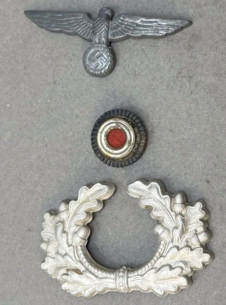 Original WWII German Army EM/NCO’S VISOR CAP EAGLE. And Wreath (Schirmmützen Adler) Certified. Visor caps were a standard item for all personnel during the Third Reich period and regulations dictated the form of dress they were to be worn with based on the individual’s rank. Officers and certain senior NCO ranks were responsible for purchasing their own caps and as a result were allotted a clothing allowance through the army’s Kleiderkasse, (Clothing Account), system. The Officers and certain senior NCO’s could choose to purchase their caps from the armed forces clothing depots or to privately purchase visor caps of higher quality. Although enlisted personnel were issued their caps from government supplies they were also permitted to purchase privately tailored caps although the price may have been restrictive. Originally the insignia worn on the visor cap consisted of the Weimar Reichsheer pattern oak-leaf wreath and cockade until March 14TH 1933 when the Reichswehr’s oval black, red and gold cockade was replaced with a circular cockade in black, white, and red. On February 17TH 1934 the Third Reich pattern national eagle for the army was officially introduced for wear on the visor cap. In March 1935 a new, more detailed, pattern wreath and cockade and a second, larger pattern national eagle were also introduced for wear and were utilized until the end of the war. The new insignia came in a variety of manufacturing styles to include stamped alloy, hand embroidered and even machine woven in some instances. EM/NCO ranks generally utilized the stamped metal type of insignia on their visor caps as opposed to the hand embroidered insignia usually used on Officer’s visor caps. Nice, set. A few Original prongs are intact (see photos) some of the original silver wash still intact. Good example showing the expected minor age and wear. In good but used condition with slight tarnish. Gettysburg Museum Certified (COA) provided. 100% Guaranteed to be authentic brought home by a U.S. Veteran. Sold for historic purposes only. See our other pieces on our web site. Also note when browsing our web site there are several pages of items, at the bottom of the list look for other page numbers. Great artifact! don’t miss it! GOOD BUT USED CONDITION! RARE!
