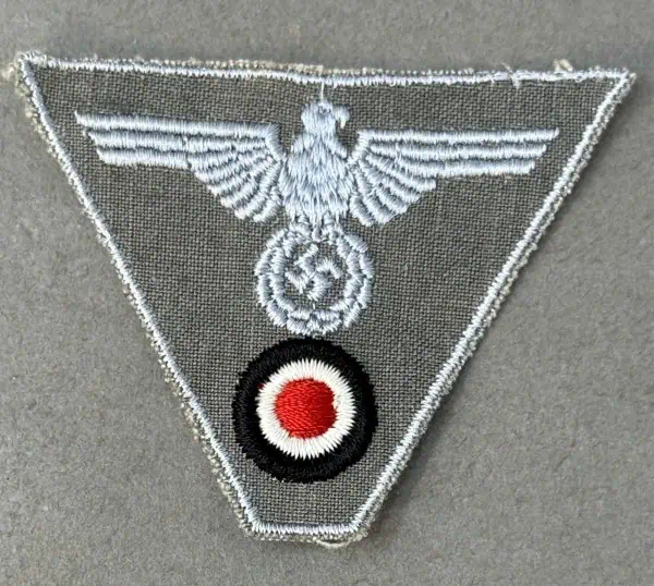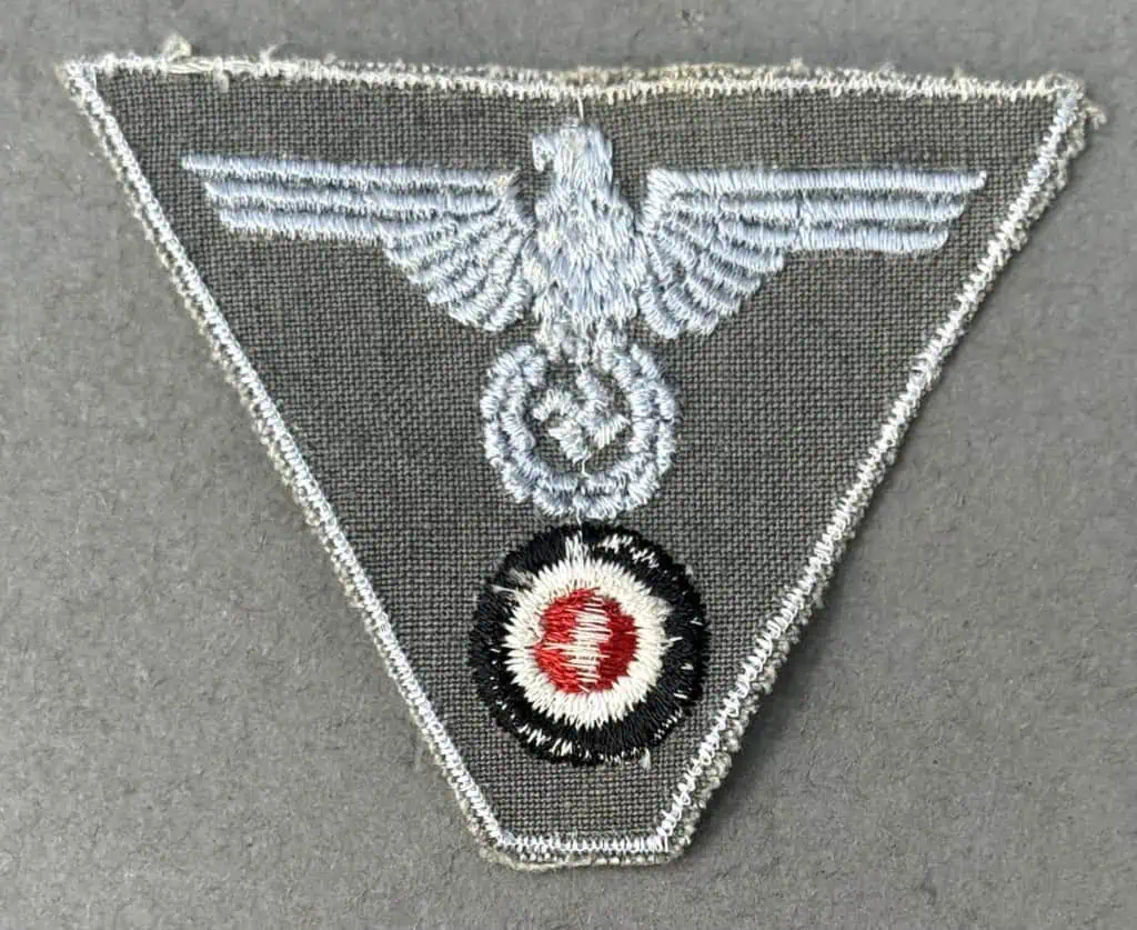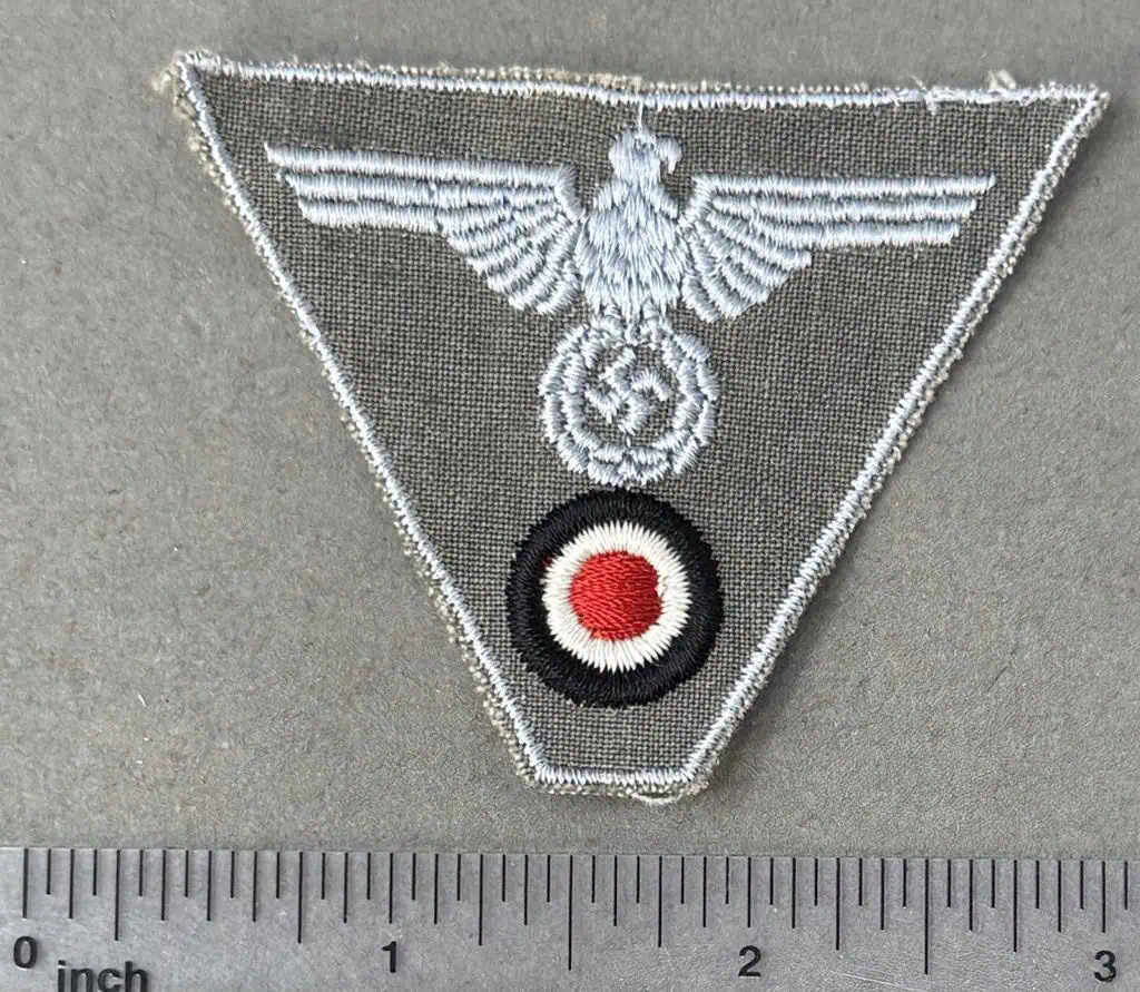 Original WWII German Army (Heer) EM/NCO’S M44 TRAPEZOID CAP INSIGNIA. (Mützen Abzeichen) Certified. The German army originally adopted a slightly modified version of the NSDAP’s, Nationalsozialistische Deutsche Arbeiterpartei, (National Socialist German Worker’s Party), national eagle by order on February 17TH 1934, with instructions to have it applied to all steel helmets, visor caps, and tunics by May 1ST 1934. Regulations followed on October 30TH 1935 that stipulated the national eagle was also to be applied to all field caps. Generally the national eagle for wear on the EM/NCO’s overseas and M43 field caps were machine woven, first in white on a dark green base, (circa 1934), then later in matte grey on a field-grey base, (circa 1939), while Officer’s versions were embroidered in bright, silver/aluminum wire threads. A machine woven version in bright, silver/aluminum flat-wire threads was also utilized by Officers but was also very popular with senior NCO’s. Originally the Weimar, Reichswehr, (National Defence Force, Circa 1919-1933), era, oval black, red and gold national cockade was utilized until it was replaced with a circular national cockade in black, white, and red on March 14TH 1933 and utilized through-out the Third Reich period on all soft caps with minor manufacturing variations. In May 1943 a new configuration of cap insignia with the national eagle and tri-color cockade on a single trapezoidal base was introduced for wear on the M42 overseas and M43 field caps. Originally produced in a machine woven version in 1944 the trapezoidal insignia also began to be produced in machine embroidered version. Machine embroidered national eagle with outstretched wings, clutching a wreathed, canted, swastika in it’s talons in silver/grey rayon threads, positioned above a national tri-color cockade with a black outer circle encompassing a white inner circle and a red center dot, on a loosely woven, brownish/field-grey rayon trapezoidal base. The outer edge of the trapezoidal base has reinforcement stitching in the same silver/grey threads as the eagle.. Good condition with some wear and storage age. 100% Guaranteed to be authentic Complete museum documentation (COA) Provided. Certified by The Gettysburg Museum of History. Please see our other items. Also note when browsing our web site there are several pages of items, at the bottom of the list look for other page numbers. Do Not Miss This One the M44 is scarce! Not as many were used at the ending of the war!