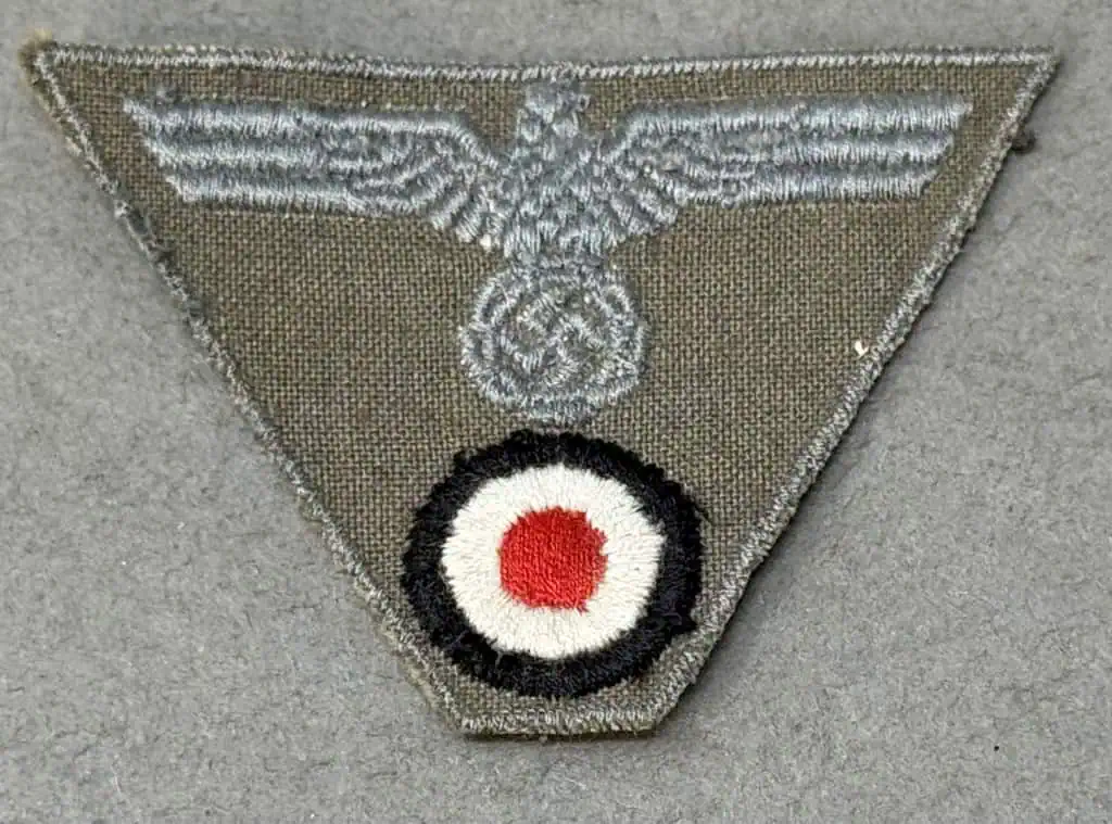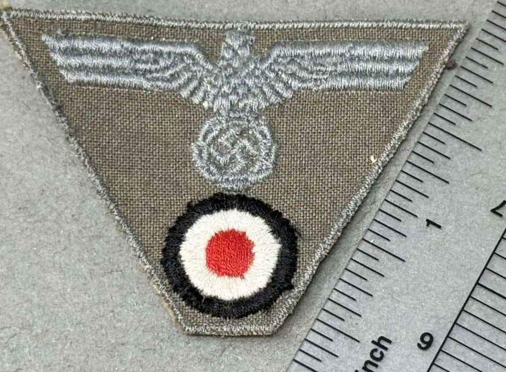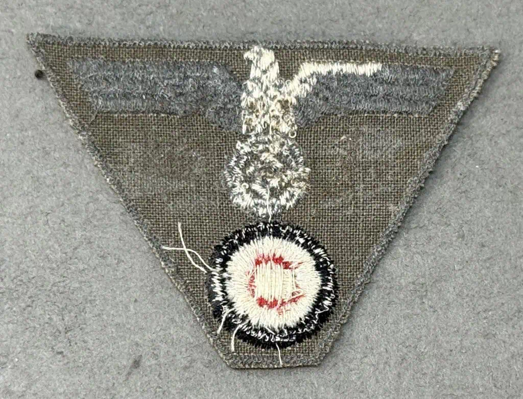 Original WWII German Army (Heer) EM/NCO’S M44 TRAPEZOID CAP INSIGNIA. (Mützen Abzeichen) Certified. The German army originally adopted a slightly modified version of the NSDAP’s, Nationalsozialistische Deutsche Arbeiterpartei, (National Socialist German Worker’s Party), national eagle by order on February 17TH 1934, with instructions to have it applied to all steel helmets, visor caps, and tunics by May 1ST 1934. Regulations followed on October 30TH 1935 that stipulated the national eagle was also to be applied to all field caps. Generally the national eagle for wear on the EM/NCO’s overseas and M43 field caps were machine woven, first in white on a dark green base, (circa 1934), then later in matte grey on a field-grey base, (circa 1939), while Officer’s versions were embroidered in bright, silver/aluminum wire threads. A machine woven version in bright, silver/aluminum flat-wire threads was also utilized by Officers but was also very popular with senior NCO’s. Originally the Weimar, Reichswehr, (National Defence Force, Circa 1919-1933), era, oval black, red and gold national cockade was utilized until it was replaced with a circular national cockade in black, white, and red on March 14TH 1933 and utilized through-out the Third Reich period on all soft caps with minor manufacturing variations. In May 1943 a new configuration of cap insignia with the national eagle and tri-color cockade on a single trapezoidal base was introduced for wear on the M42 overseas and M43 field caps. Originally produced in a machine woven version in 1944 the trapezoidal insignia also began to be produced in machine embroidered version. Machine embroidered national eagle with outstretched wings, clutching a wreathed, canted, swastika in it’s talons in silver/grey rayon threads, positioned above a national tri-color cockade with a black outer circle encompassing a white inner circle and a red center dot, on a loosely woven, brownish/field-grey rayon trapezoidal base. The outer edge of the trapezoidal base has reinforcement stitching in the same silver/grey threads as the eagle.. Good condition with some wear and storage age. 100% Guaranteed to be authentic Complete museum documentation (COA) Provided. Certified by The Gettysburg Museum of History. Please see our other items. Also note when browsing our web site there are several pages of items, at the bottom of the list look for other page numbers. Do Not Miss This One the M44 is scarce! Not as many were used at the ending of the war!
