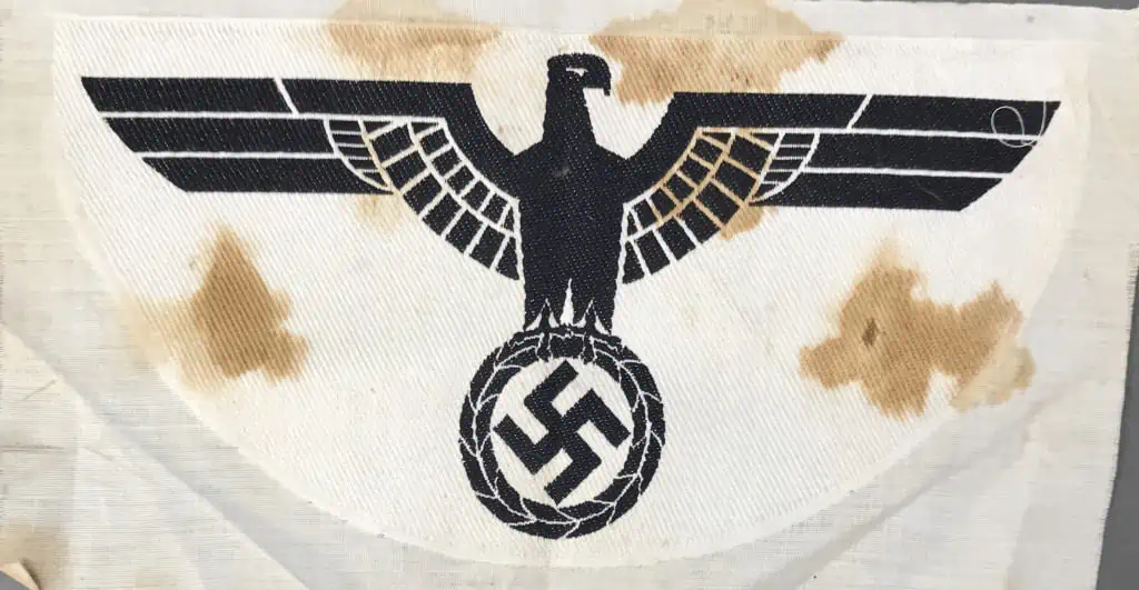 Original WWII German Army (Heer) LARGE SPORT SHIRT EAGLE. (Wehrmachtsportabzeichen) Certified. Physical fitness of its personnel was a prime concern of the German army, and each new recruit was issued a specific sport uniform that consisted of a pullover “tank top” style shirt, navy blue, later black, shorts and athletic shoes. Regulations of October 22ND 1932 introduced the Troop Sports Badge that was to be applied to the front center of the sports shirt. On May 14TH 1935 the M35 sports shirt eagle for EM/NCO’s was introduced to replace the previously used Reichswehr era Troop Sports Badge. Of Note: NCO ranks were identified by the addition of a black stripe around the neck of the sports shirt. The insignia consists of a white, rayon, half-moon shaped base with a black, machine woven, national eagle, without-stretched wings, clutching a wreathed, canted swastika in it’s talons, to the center. The eagle’s wingspan is roughly 9″ wide from wing tip to wing tip. Typical storage wear, with staining in used condition. Complete museum documentation (COA) Provided. Certified by The Gettysburg Museum of History. 100% guaranteed to be authentic. The Gettysburg Museum of History does not support or condone Adolf Hitler or the Nazi Party and is only offering this as a historic relic. Please see our other items. Also note when browsing our web site there are several pages of items, at the bottom of the list look for other page numbers. NICE BIG EAGLE