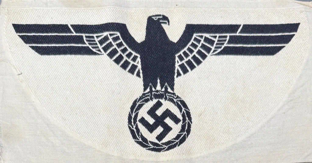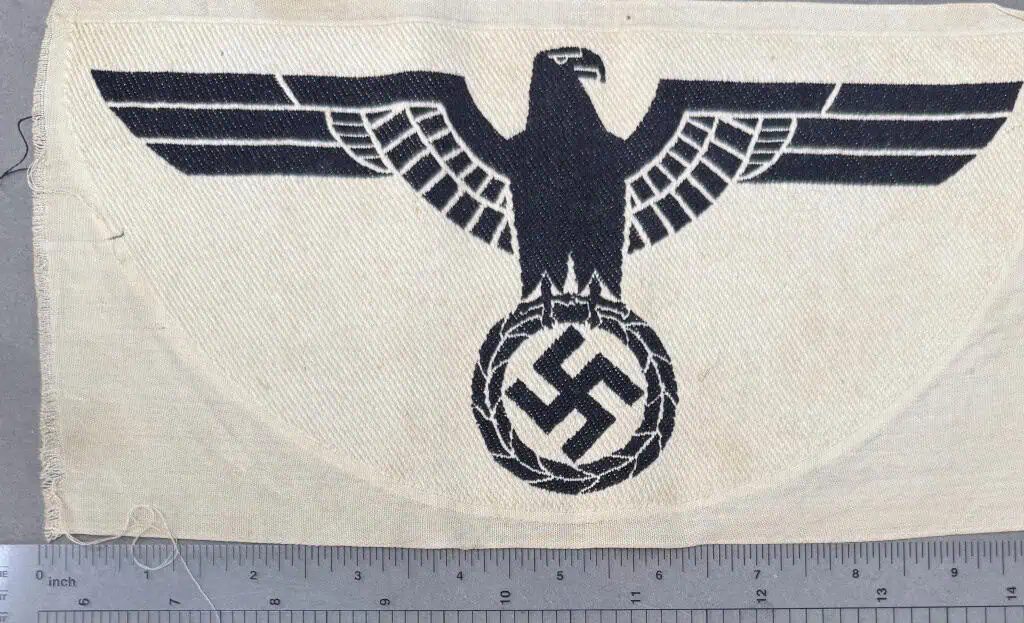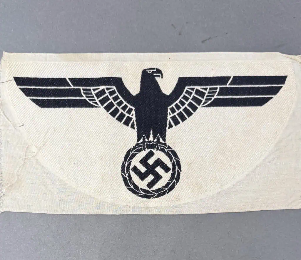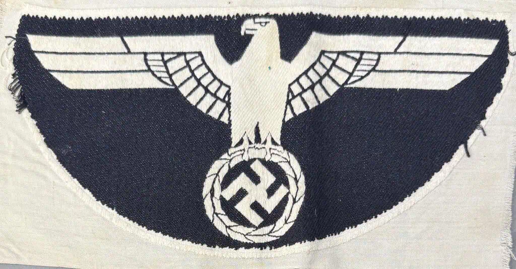 Original WWII German Army (Heer) LARGE SPORT SHIRT EAGLE. (Wehrmachtsportabzeichen) Certified. Physical fitness of its personnel was a prime concern of the German army and each new recruit was issued a specific sport uniform that consisted of a pullover “tank top” style shirt, navy blue, later black, shorts and athletic shoes. Regulations of October 22ND 1932 introduced the Troop Sports Badge that was to be applied to the front center of the sports shirt. On May 14TH 1935 the M35 sports shirt eagle for EM/NCO’s was introduced to replace the previously used Reichswehr era Troop Sports Badge. Of Note: NCO ranks were identified by the addition of a black stripe around the neck of the sports shirt. The insignia consists of a white, rayon, half-moon shaped base with a black, machine woven, national eagle, with out-stretched wings, clutching a wreathed, canted swastika in it’s talons, to the center. The eagles wingspan is roughly 9″ wide from wing tip to wing tip. Typical storage wear, Very good condition. Complete museum documentation (COA) Provided. Certified by The Gettysburg Museum of History. 100% guaranteed to be authentic. The Gettysburg Museum of History does not support or condone Adolf Hitler or the Nazi Party and is only offering this as a historic relic. Please see our other items. Also note when browsing our web site there are several pages of items, at the bottom of the list look for other page numbers. NICE BIG EAGLE