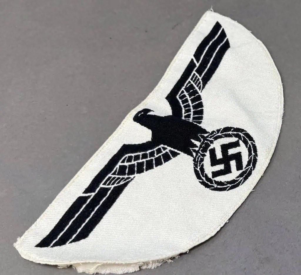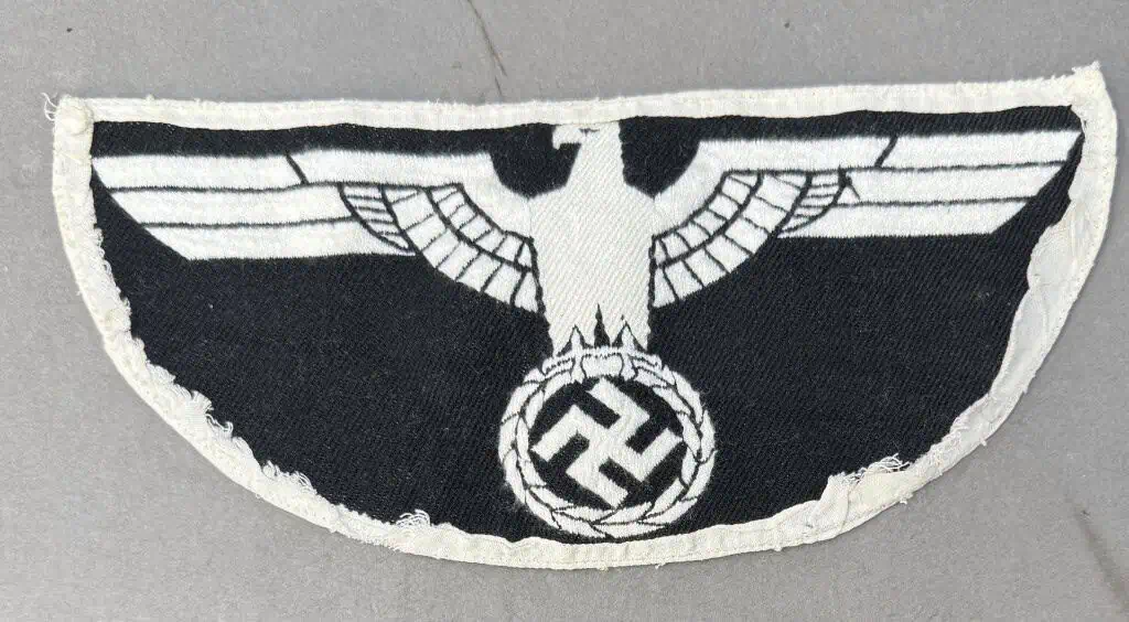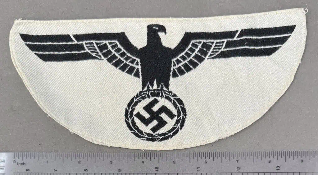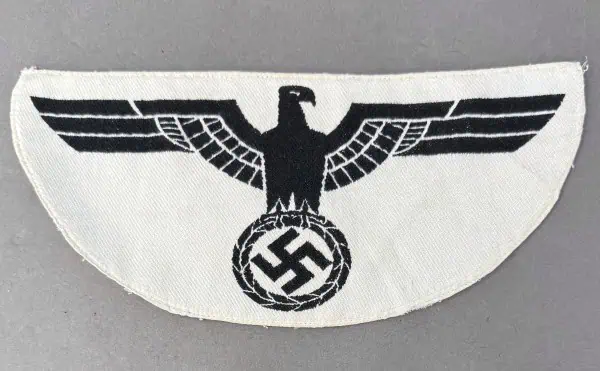Original WWII German Army (Heer) LARGE SPORT SHIRT EAGLE. (Wehrmachtsportabzeichen) Certified. Physical fitness of its personnel was a prime concern of the German army and each new recruit was issued a specific sport uniform that consisted of a pullover “tank top” style shirt, navy blue, later black, shorts and athletic shoes. Regulations of October 22ND 1932 introduced the Troop Sports Badge that was to be applied to the front center of the sports shirt. On May 14TH 1935 the M35 sports shirt eagle for EM/NCO’s was introduced to replace the previously used Reichswehr era Troop Sports Badge. Of Note: NCO ranks were identified by the addition of a black stripe around the neck of the sports shirt.  The insignia consists of a white, rayon, half-moon shaped base with a black, machine woven, national eagle, with out-stretched wings, clutching a wreathed, canted swastika in it’s talons, to the center. The eagles wingspan is roughly 9″ wide from wing tip to wing tip. Typical storage wear, Very good condition.   Complete museum documentation (COA) Provided. Certified by The Gettysburg Museum of History. 100% guaranteed to be authentic. The Gettysburg Museum of History does not support or condone Adolf Hitler or the Nazi Party and is only offering this as a historic relic. Please see our other items.    Also note when browsing our web site there are several pages of items, at the bottom of the list look for other page numbers. NICE BIG EAGLE