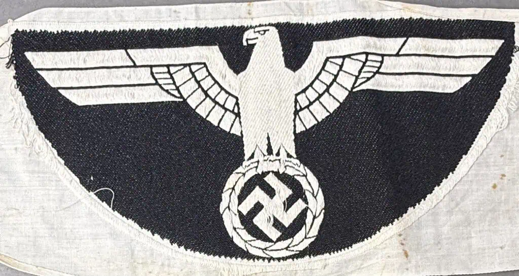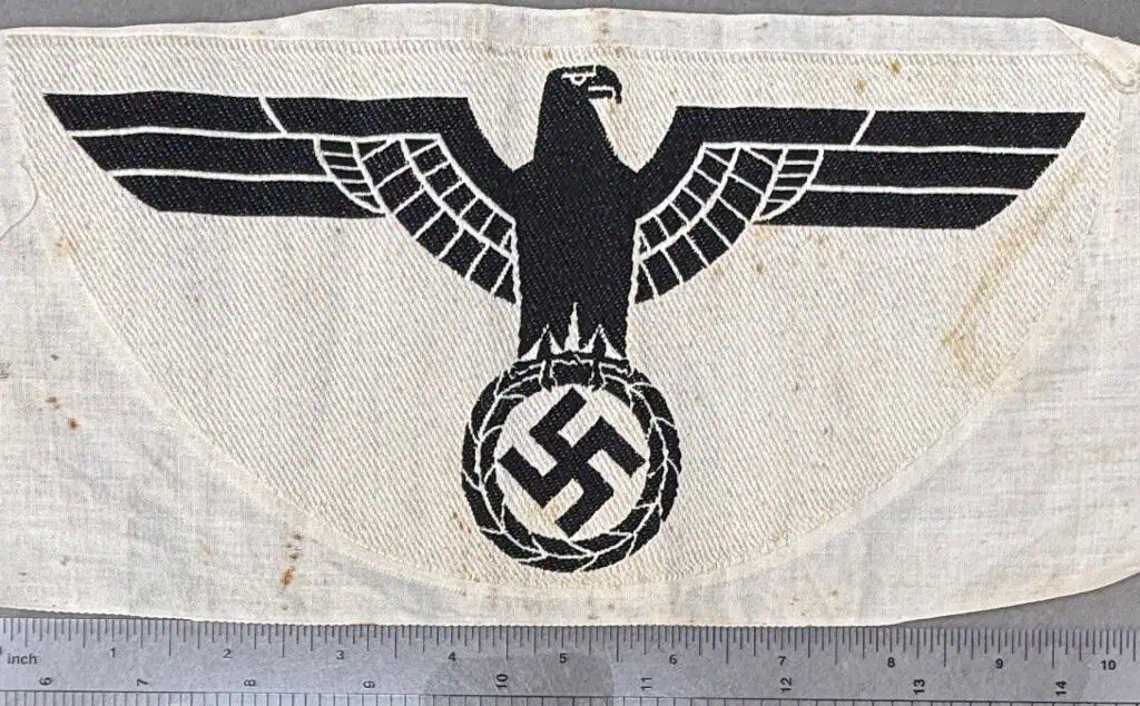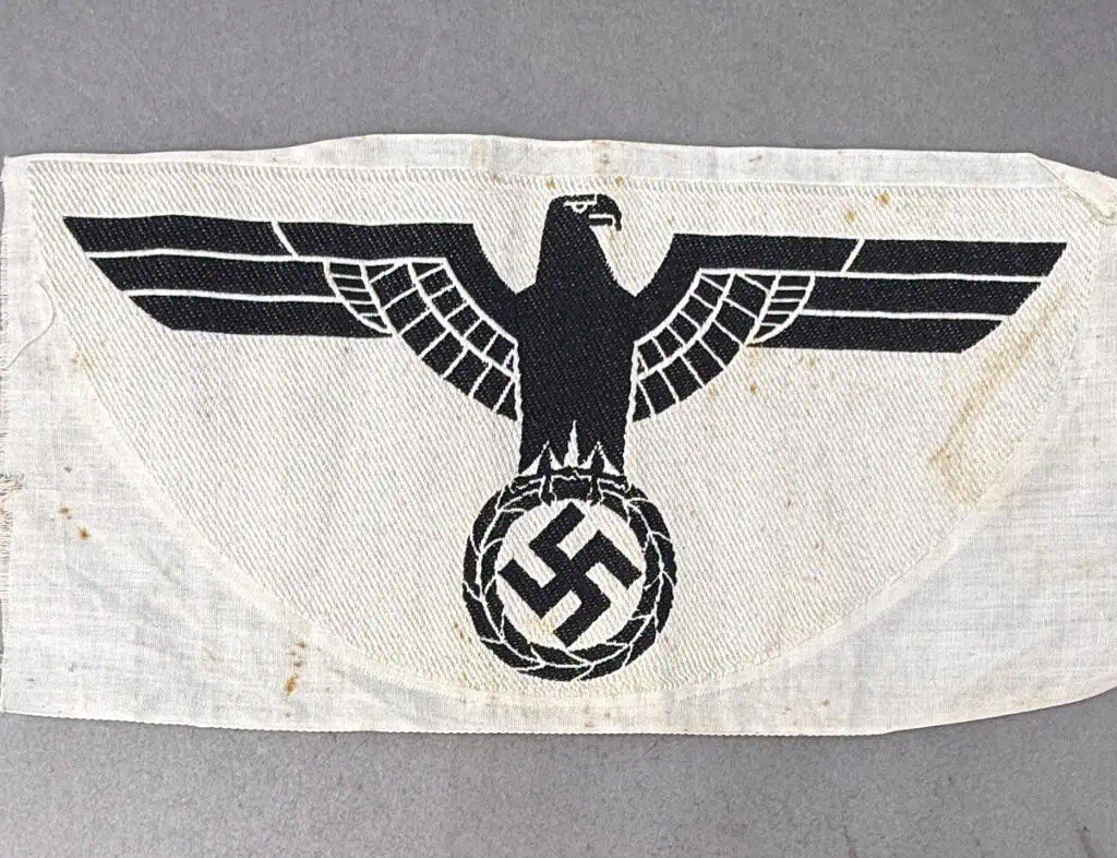 Original WWII German Army (Heer) LARGE SPORT SHIRT EAGLE. (Wehrmachtsportabzeichen) Certified. Physical fitness of its personnel was a prime concern of the German army and each new recruit was issued a specific sport uniform that consisted of a pullover “tank top” style shirt, navy blue, later black, shorts and athletic shoes. Regulations of October 22ND 1932 introduced the Troop Sports Badge that was to be applied to the front center of the sports shirt. On May 14TH 1935 the M35 sports shirt eagle for EM/NCO’s was introduced to replace the previously used Reichswehr era Troop Sports Badge. Of Note: NCO ranks were identified by the addition of a black stripe around the neck of the sports shirt.  The insignia consists of a white, rayon, half-moon shaped base with a black, machine woven, national eagle, with out-stretched wings, clutching a wreathed, canted swastika in it’s talons, to the center. The eagles wingspan is roughly 9″ wide from wing tip to wing tip. Typical storage wear, Very good condition.   Complete museum documentation (COA) Provided. Certified by The Gettysburg Museum of History. 100% guaranteed to be authentic. The Gettysburg Museum of History does not support or condone Adolf Hitler or the Nazi Party and is only offering this as a historic relic. Please see our other items.    Also note when browsing our web site there are several pages of items, at the bottom of the list look for other page numbers. NICE BIG EAGLE