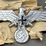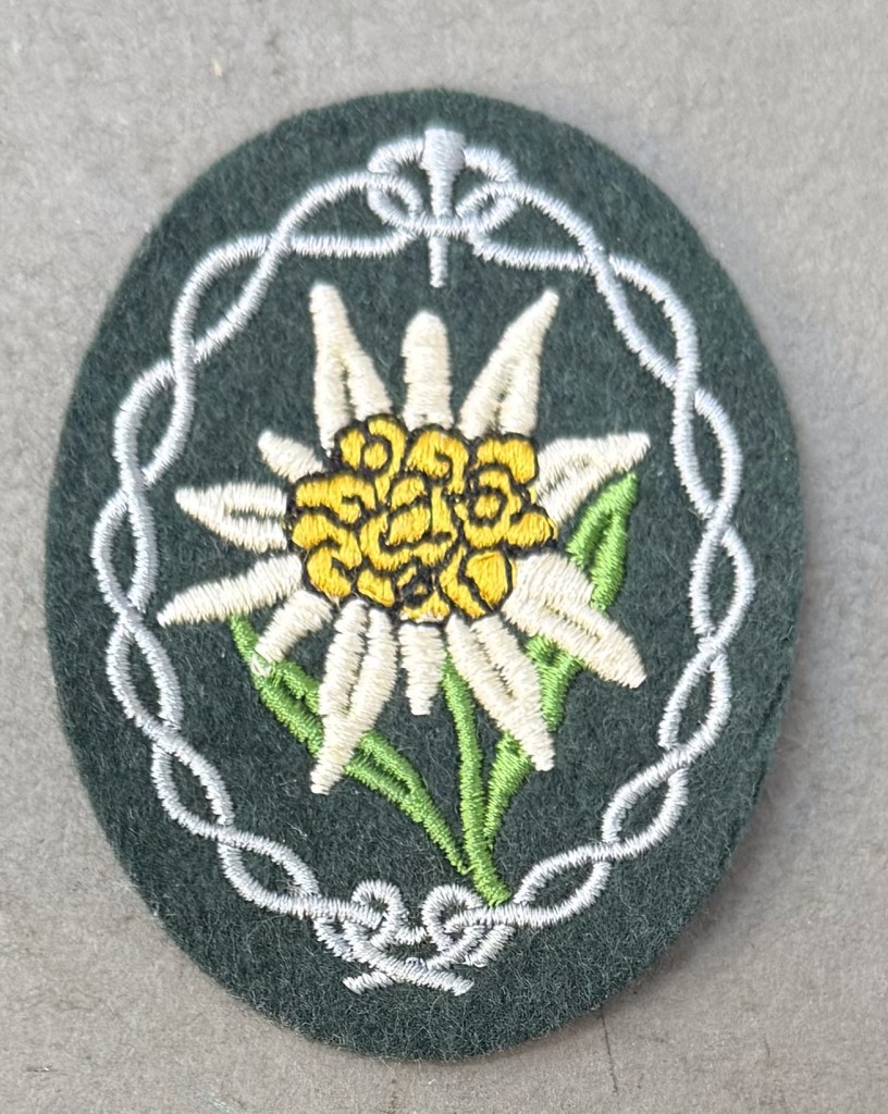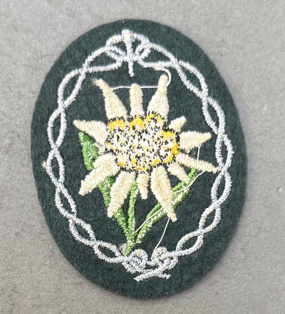 Original WWII German Army (Heer) MOUNTAIN TROOP SLEEVE EDELWEISS. (Gebirgsjäger Edelweiss Ärmelabzeichen) Certified. During WWII the German army fielded nine Gebirgsjäger, (Mountain Troop), Divisions with an additional six Waffen-SS, (Armed-SS), Mountain Divisions. Generally speaking, the Mountain Divisions were specially trained and equipped Infantry Divisions designed for mountainous warfare. On May 2ND 1939 the OKH, Oberkommando des Heeres, (High Command of the Army), authorized wear of a distinctive Edelweiss tradition badge by Mountain Troop personnel to be worn on the upper right sleeve of the service, dress and field uniforms. The design of the Edelweiss badge was based on a badge introduced by Emperor Franz-Joseph I in 1907 for the Austro-Hungarian Alpine troops and granted for wear by Imperial German Alpine troops in 1915 as an honorary emblem of bravery. Of Note: The Edelweiss, (Noble White), (scientifically, Leontopodium Alpinum), is a European Mountain flower of the Asteraceae, (Sunflower), family which tends to flourish in inaccessible, rocky, limestone locations at altitudes ranging from roughly, 6,560 to 9,515 feet, (2,000 to 2,900 meters), making it a most suitable emblem for Mountain troops. On introduction the badge was on a blue/green badge cloth base, but in early 1940 this was altered to a field-grey wool base. Of Note: A metal Edelweiss with stem was designed for wear on the mountain cap and a stemless Edelweiss was authorized for wear on the visor cap. Original regulations, unsuccessfully, dictated the Edelweisses were to be removed from wear if the personnel were transferred out of a Mountain Troop unit. On November 12TH 1944 regulations were altered to permitted continued wear of the Edelweiss after transferring out of a Mountain Troop unit as long as the individual had combat experience with the Mountain Troops. Generally, EM/NCO personnel utilized machine embroidered or woven Edelweiss while officers’ ranks wore higher quality, hand embroidered edelweis. The 1940 pattern sleeve insignia features a vertically oval, field-grey wool base with a machine embroidered edelweiss flower with thirteen, irregular, white petals, an eight bulb, yellow stamen and dual green leaves and stem in rayon threads. The edelweiss is encompassed with a simulated, silver/grey, mountaineer rope border, with a white piton to the top center. good example showing the expected minor age and wear slight fading on the black area In good but used condition. Gettysburg Museum Certified (COA) provided. 100% Guaranteed to be authentic. Sold for historic purposes only. See our other pieces on our web site. Also note when browsing our web site there are several pages of items, at the bottom of the list look for other page numbers. Great artifact! don’t miss it! RARE EARLY HIGH QUALITY VERSION!