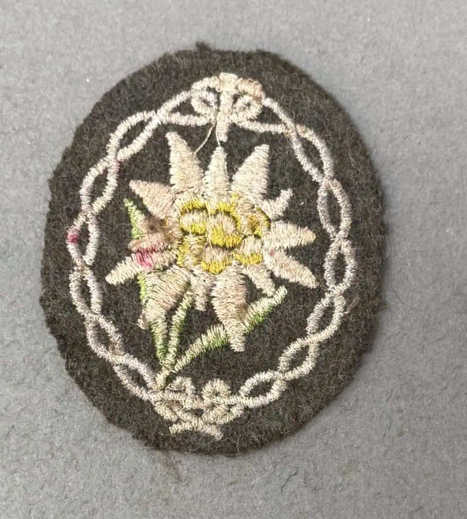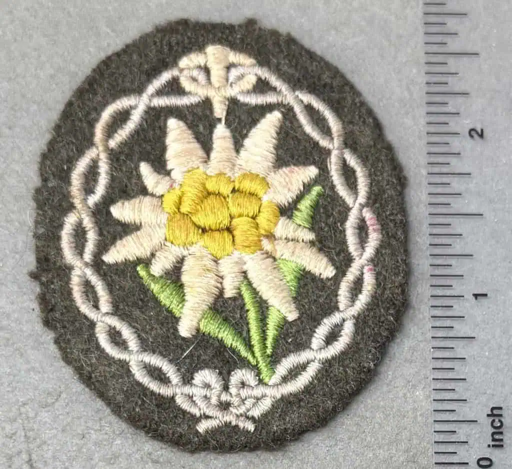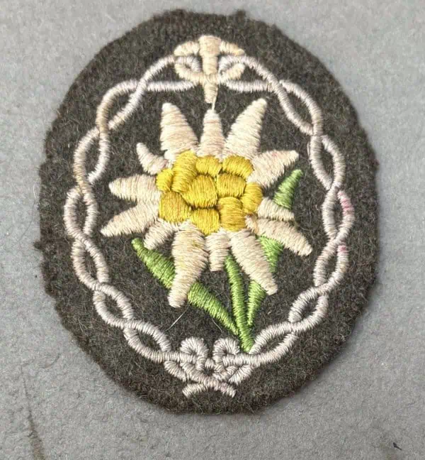 Original WWII German Army (Heer) MOUNTAIN TROOP SLEEVE EDELWEISS. (Gebirgsjäger Edelweiss Ärmelabzeichen) Certified. During WWII the German army fielded nine Gebirgsjäger, (Mountain Troop), Divisions with an additional six Waffen-SS, (Armed-SS), Mountain Divisions. Generally speaking, the Mountain Divisions were specially trained and equipped Infantry Divisions designed for mountainous warfare. On May 2ND 1939 the OKH, Oberkommando des Heeres, (High Command of the Army), authorized wear of a distinctive Edelweiss tradition badge by Mountain Troop personnel to be worn on the upper right sleeve of the service, dress and field uniforms. The design of the Edelweiss badge was based on a badge introduced by Emperor Franz-Joseph I in 1907 for the Austro-Hungarian Alpine troops and granted for wear by Imperial German Alpine troops in 1915 as an honorary emblem of bravery. Of Note: The Edelweiss, (Noble White), (scientifically, Leontopodium Alpinum), is a European Mountain flower of the Asteraceae, (Sunflower), family which tends to flourish in inaccessible, rocky, limestone locations at altitudes ranging from roughly, 6,560 to 9,515 feet, (2,000 to 2,900 meters), making it a most suitable emblem for Mountain troops. On introduction the badge was on a blue/green badge cloth base, but in early 1940 this was altered to a field-grey wool base. Of Note: A metal Edelweiss with stem was designed for wear on the mountain cap and a stemless Edelweiss was authorized for wear on the visor cap. Original regulations, unsuccessfully, dictated the Edelweisses were to be removed from wear if the personnel were transferred out of a Mountain Troop unit. On November 12TH 1944 regulations were altered to permitted continued wear of the Edelweiss after transferring out of a Mountain Troop unit as long as the individual had combat experience with the Mountain Troops. Generally, EM/NCO personnel utilized machine embroidered or woven Edelweiss while officers’ ranks wore higher quality, hand embroidered edelweis. The 1940 pattern sleeve insignia features a vertically oval, field-grey wool base with a machine embroidered edelweiss flower with thirteen, irregular, white petals, an eight bulb, yellow stamen and dual green leaves and stem in rayon threads. The edelweiss is encompassed with a simulated, silver/grey, mountaineer rope border, with a white piton to the top center. good example showing the expected minor age and wear slight fading on the black area In good but used condition. Gettysburg Museum Certified (COA) provided. 100% Guaranteed to be authentic. Sold for historic purposes only. See our other pieces on our web site. Also note when browsing our web site there are several pages of items, at the bottom of the list look for other page numbers. Great artifact! don’t miss it!