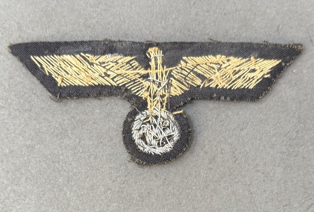 Original WWII German Army (Heer) OFFICER’S BREAST EAGLE. (Hoheitsabzeichen) Bullion Certified. The German army originally adopted a slightly modified version of the NSDAP’s, national eagle by order on February 17TH 1934, with instructions to have it applied to all steel helmets, visor caps, and tunics by May 1ST 1934. Later amendments to the introductory order stipulated that the national eagle was also to be worn on all field caps, the sports uniform and the black panzer wrap. The eagle came in three distinct designs with two having slightly different out-stretched wings and the third with down-swept wings. Generally, Officer’s ranks utilized hand or machine embroidered breast eagles while EM/NCO’s ranks utilized machine embroidered or machine woven breast eagles. During the war the breast eagles were manufactured in a variety of slightly different manufacturing techniques and colorations. Hand embroidered, national breast eagle with out-stretched wings, clutching a wreathed, canted, swastika in it’s talons in bright, silver/aluminum bullion and wire threads with accent threads mounted on a cut-out dark blue/green badge cloth base. Uniform removed. (see photos). Typical use wear, good combat worn condition. Complete museum documentation (COA) Provided. Certified by The Gettysburg Museum of History. 100% guaranteed to be authentic. The Gettysburg Museum of History does not support or condone Adolf Hitler or the Nazi Party and is only offering this as a historic relic. Please see our other items. Also note when browsing our web site there are several pages of items, at the bottom of the list look for other page numbers. Outstanding Used Example!