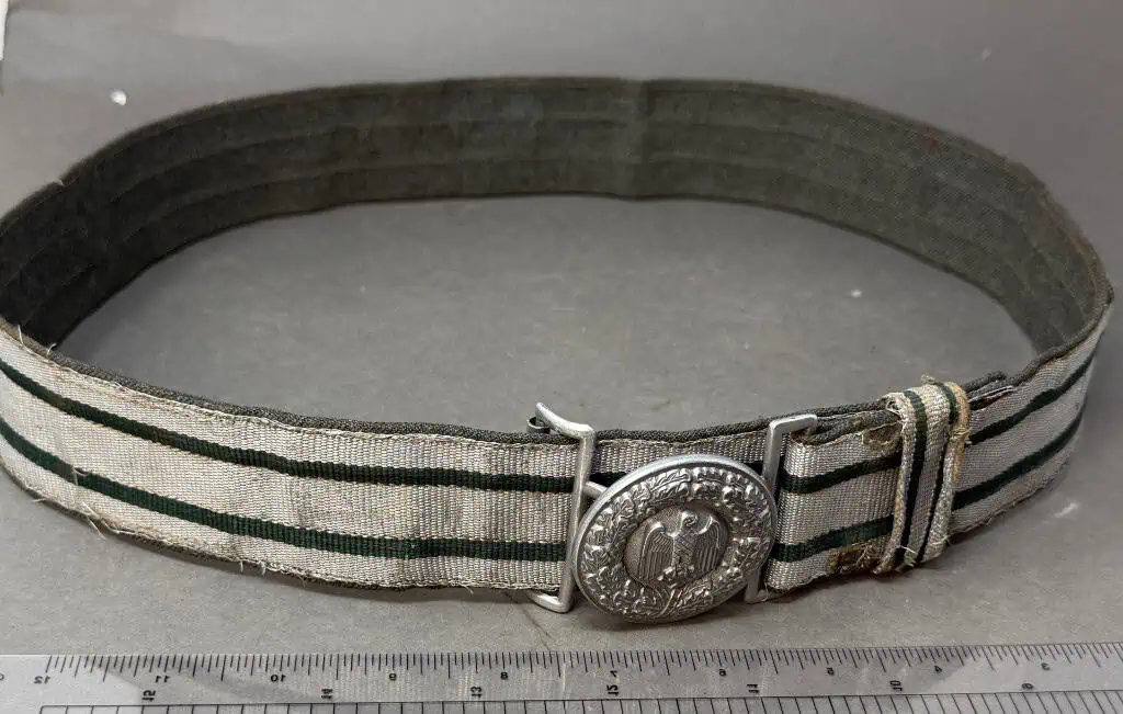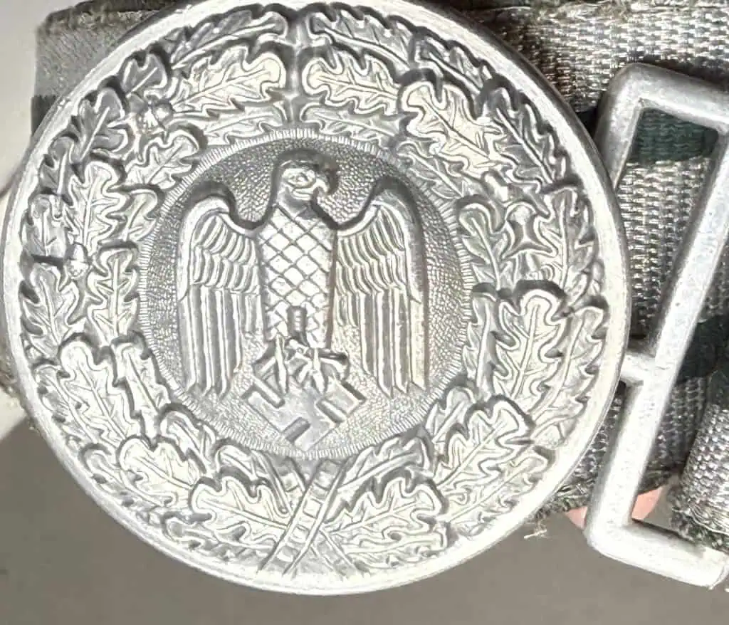 Original WWII German Army (Heer) OFFICER’S BROCADE BELT & BELT BUCKLE. (Feldbinde und Feldbindenschloß für Offizier) Certified. Military belts and their corresponding buckles date back centuries and were initially designed for attaching swords and daggers. In 1847 a new innovative box buckle with a quick release catch and corresponding belt were introduced which resulted in a Prussian, Hauptmann Virschow, initiating a new method of carrying personal equipment with the belt and shoulder straps supporting the majority of the weight. This system, with modifications, remains in use in most of the armies in the world to this day. During the Third Reich there was a prescribed form of wear of the belt and buckle with the buckle being positioned on the right side and the corresponding buckle catch on the left side. The Officer’s circular belt buckle was originally introduced on July 9TH 1937, along with the brocade belt for wear by army Officers when in parade dress, formal dress, informal reporting dress and service dress when full decorations were ordered. Wear of the brocade belt and circular belt buckle was extended to army Music Superintendents and Band Leaders on April 12TH 1938 and to army Officials with the equivalent of Officer’s ranks/position on January 2ND 1939. The belt buckle for Officers holding the ranks of Leutnant up to and including Oberst was in matte silver while Officers holding the ranks of Generalmajor up to and including Generalfeldmarschall utilized a matte gold belt buckle. The silver and green brocade belt was the same for all Officers ranks, excluding Music Superintendents and Band Leaders which utilized silver and red brocade belts. Of Note: Officers ranks were responsible for purchasing their own uniforms including belts and as a result were allotted a clothing allowance through the army’s Kleiderkasse, (Clothing Account), system. The Officers could choose to purchase their uniforms items from the armed forces clothing depots or to privately purchase items of higher quality. Nice quality, roughly 46mm wide, 108cm long, bright, silver/aluminum brocade belt. Nice complete green cloth backing. The belt comes with a two piece die stamped aluminum construction, circular belt buckle. The buckle features a highly embossed oak-leaf wreath encompassing a central Wehrmacht, (Armed Forces), style eagle with down-swept wings, clutching a canted swastika in it’s talons, on a subtlety textured, slightly domed, central field. The reverse of the buckle is a mirror image of the obverse and has a separate, circular plate insert with a crimped catch and retaining hook. The circular plate is secured by the crimped outer edges of the buckle’s obverse. The buckle retaining hook was designed to be slipped into the opened rectangular, dual pronged, belt securing bar. The catch functions well see photo) will make a great display belt. Belt is adjustable to multiple sizes. Nice example. In good but used condition, has that great look! . Brought home by a U.S .Veteran as a trophy of war.100% Guaranteed to be authentic . Complete museum documentation (COA) Provided. Please see our other German Medals and Relics From WWII. Also note when browsing our web site there are several pages of items, at the bottom of the list look for other page numbers. NICE EXAMPLE, Don’t miss it! Nicely maker marked.