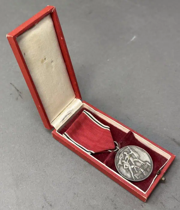 Original WWII German CASED COMMEMORATIVE MEDAL OF 13th March 1938 Certified. The Commemorative Medal of March 13TH 1938 was instituted on May 1ST 1938 for award to civilians and military personnel who participated in the annexation of Austria into Greater Germany. This was the first of the “Anschluss”, (Union, Annexation), medals, awarded for the “Flower Wars”. Having been born in Austria the union of the two countries was a cornerstone in Hitler’s foreign policy that was expressly forbidden by the Treaty of Versailles. Although the Germans and Austrians had signed an agreement that had guaranteed Austrian independence from Germany, on July 11TH 1936, Hitler was determined to absorb Austria into his realm and loyal Nazi’s within Austria did their best to disrupt the Austrian government. On February 12TH 1938 Hitler met with the Austrian Chancellor Doctor Kurt von Schuschnigg at Berchtesgaden where Hitler launched into a tirade concerning what he viewed as the Austrian problem and demanded a resolution or threatened that Austria would feel the German’s wrath by an armed invasion. The brow-beat Schuschnigg signed a new agreement with Hitler but intrigued to escape it by holding an Austrian plebiscite for the political union of the two German states, dated March 13TH 1938, in the hopes that the Austrian people would vote against the union therefore preserving Austrian independence. At the last minute with threats from Germany, the Austrian plebiscite vote was cancelled, and German troops moved in and occupied Austria. Of Note: After the Germans were established in Austria, a German sponsored plebiscite was held in which the Austrians voted with overwhelming support for the union. Silver washed, die struck alloy construction medal. The obverse of the medal features two embossed figures symbolically breaking the chains of bondage with an unfurled national flag in the background and a high relief national eagle to the bottom. The reverse features embossed Latin script to the center, “13th März 1938”, encompassed by additional script, “Ein Volk, Ein Reich, Ein Führer”. (One People, One State, One Leader). The ribbon suspension ring and medal loop are both intact and the award comes complete with its original ribbed rayon ribbon with an alloy pin back device, handstitched to the reverse top. Original case is included. In good used condition, (see photo). Gettysburg Museum Certified (COA) provided. Rare 100% Guaranteed to be authentic. Sold for historic purposes only. See our other pieces on our web site. Also note when browsing our web site there are several pages of items, at the bottom of the list look for other page numbers. Nice EXAMPLE!