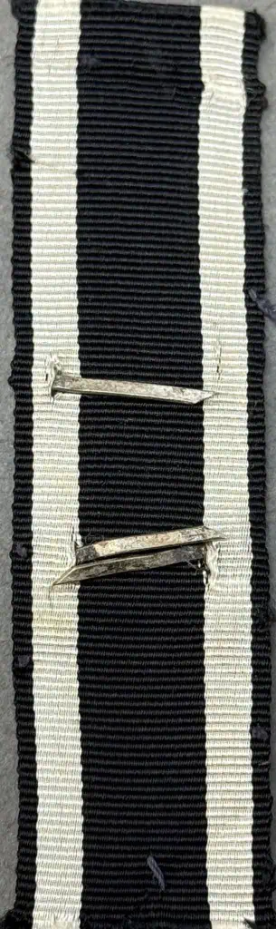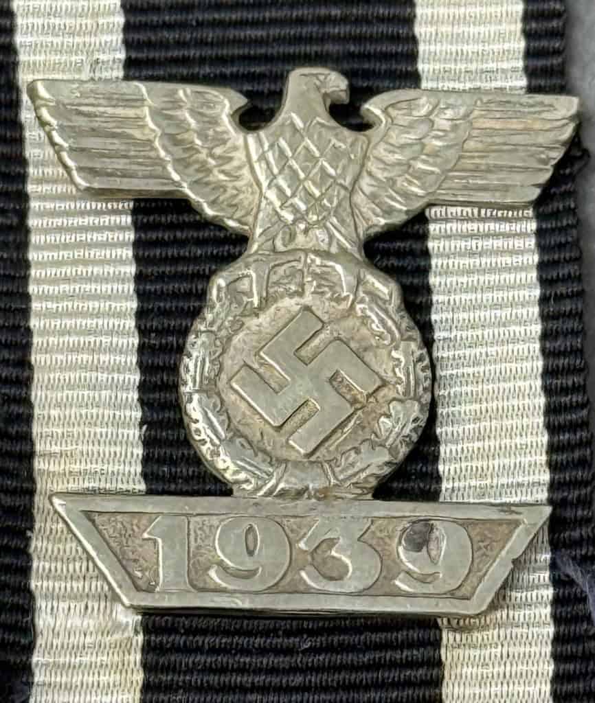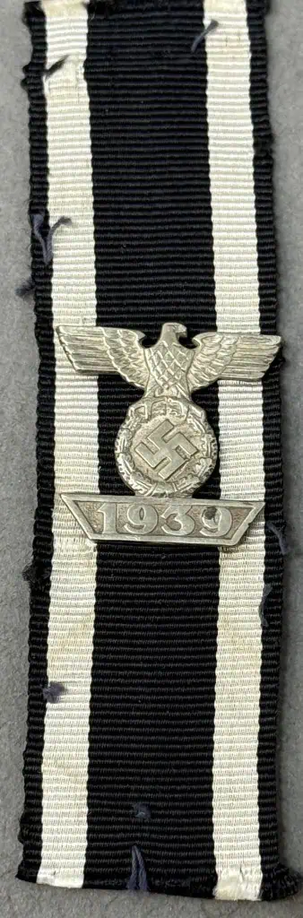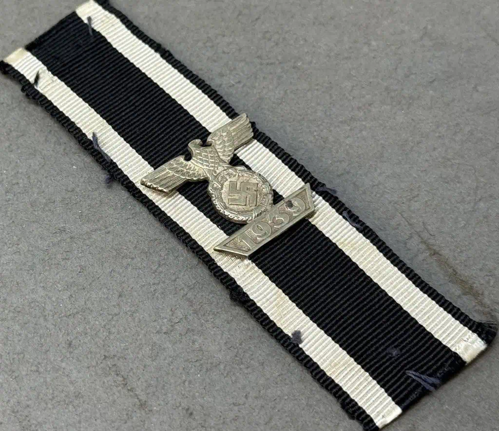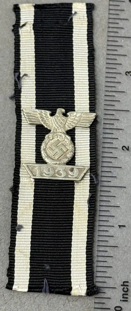Original WWII German Clasp To The Iron Cross 2nd Class Brought Home By A U.S. Veteran Certified. On September 1ST 1939 Hitler once more reinstituted the Iron Cross series of awards in the First and Second Classes and established the Knight’s Cross of the Iron Cross and two new Spangen, (Bars), for the first and second class awards to be bestowed to recipients of the 1939 Iron Cross who had also been awarded a first or second class 1914 Iron Cross during WWI. Originally the first pattern of this award had slightly scalloped tips to the ends of the date bar which was soon replaced with the second pattern award with diagonally angled ends. Recipients of an Iron Cross Bar were permitted, with the proper documentation, to privately purchase a jeweler’s copy of the award, at their own expense, if so desired. Due to the prestige of the award personnel who could afford it would opt to buy a jeweler’s copy for everyday wear with the actual award being put away for safe keeping. Nicely detailed, second pattern, die struck alloy construction award with a polished nickel/silver plated finish. The award is in the form of a national eagle with outstretched wings, clutching an oak-leaf wreath which encompasses a canted swastika above a horizontal, trapezoidal, date bar with diagonally angled ends, and embossed institution date, “1939”. The award shows nice detailing including feathering to the eagles wings and a subtly textured background field to the swastika and the date bar. The reverse has Three of its original four, horizontal, soldered attachment prongs intact (see photos). . Still attached to the ribbon of the Iron Cross 2nd Class 1914. Excellent condition. Gettysburg Museum Certified (COA) provided. Rare 100% Guaranteed to be authentic. Sold for historic purposes only. See our other pieces on our web site. Also note when browsing our web site there are several pages of items, at the bottom of the list look for other page numbers. Excellent!!