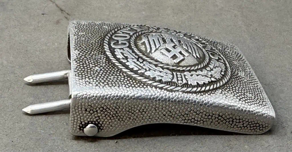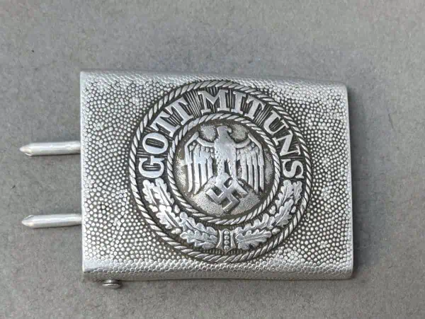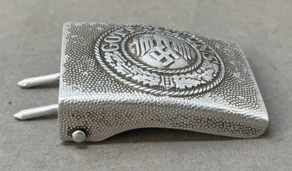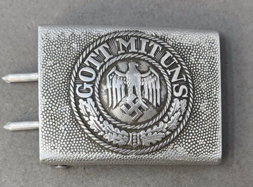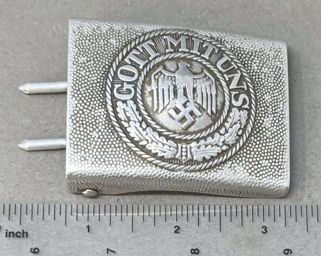 Original WWII German Combat Used Wehrmacht (Army) Belt Buckle Brought Home By A U.S. Soldier Certified. Early, (circa 1936-1940), injection molded construction, natural aluminum box buckle with a pebbled background field and a slightly domed, embossed central motif. The central motif features an embossed Wehrmacht style eagle with down swept wings on a subtly pebbled field to the center, encompassed by an embossed oak-leaf cluster to the bottom and script, “Gott Mit Uns”, (God with Us), to the top. The oak-leaf cluster and script are on a ribbed background field and are encircled by both an inner and outer simulated twisted rope border. The reverse has the integral, raised, slotted buckle catch and separate prong bar and prongs all intact! A good combat used example with honest wear in good used condition. Complete museum documentation (COA) Provided. Certified by The Gettysburg Museum of History. The Gettysburg Museum of History does not support or condone Adolf Hitler or the Nazi Party and is only offering this as a historic relic. Please see our other items. Also note when browsing our web site there are several pages of items, at the bottom of the list look for other page numbers.