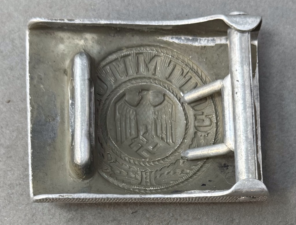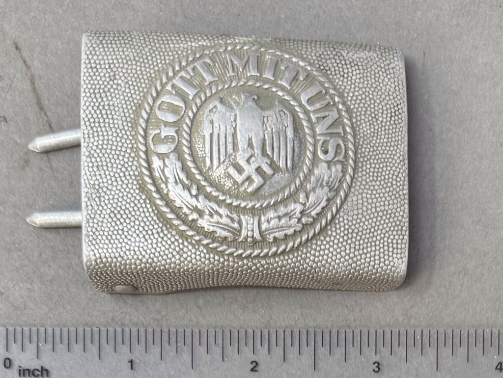 Original WWII German Combat Used Wehrmacht (Army) Belt Buckle Brought Home By A U.S. Soldier Certified. Early, (circa 1936-1940), injection molded construction, natural aluminum box buckle with a pebbled background field and a slightly domed, embossed central motif. The central motif features an embossed Wehrmacht style eagle with down swept wings on a subtly pebbled field to the center, encompassed by an embossed oak-leaf cluster to the bottom and script, “Gott Mit Uns”, (God with Us), to the top. The oak-leaf cluster and script are on a ribbed background field and are encircled by both an inner and outer simulated twisted rope border. The reverse has the integral, raised, slotted buckle catch and separate prong bar and prongs all intact! A good combat used example with honest wear in good used condition. Complete museum documentation (COA) Provided. Certified by The Gettysburg Museum of History. The Gettysburg Museum of History does not support or condone Adolf Hitler or the Nazi Party and is only offering this as a historic relic. Please see our other items.  Also note when browsing our web site there are several pages of items, at the bottom of the list look for other page numbers.