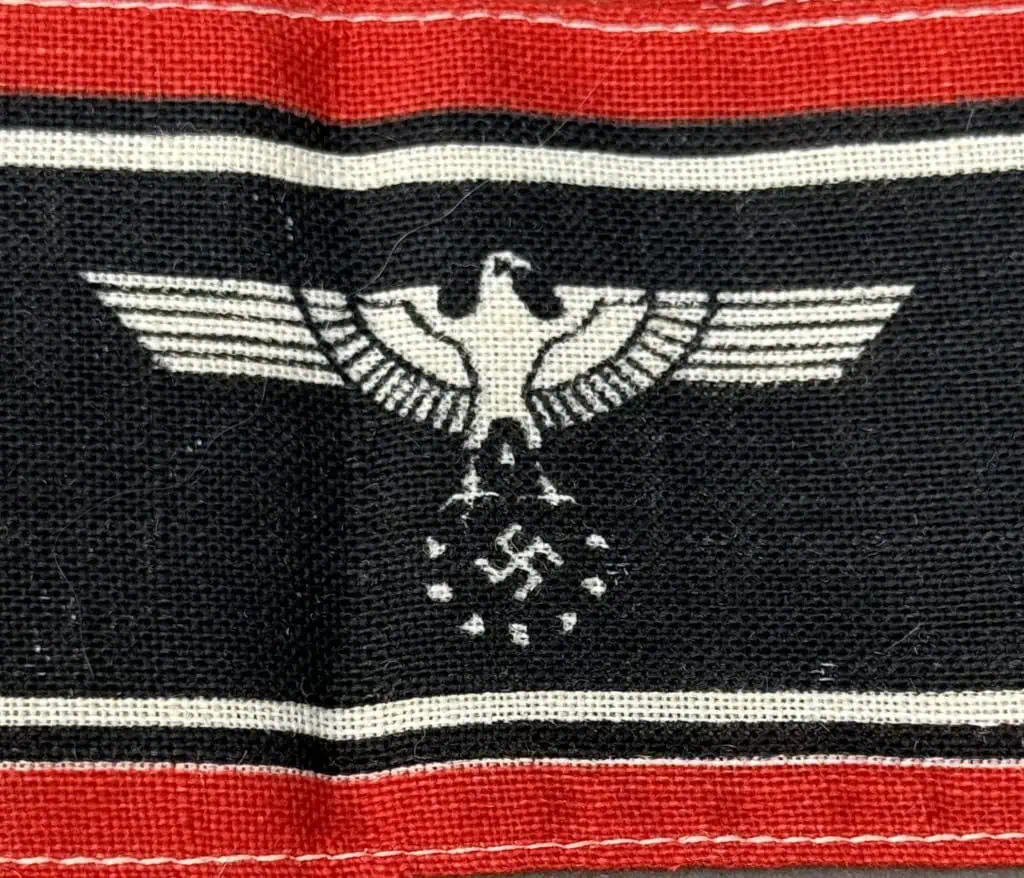 Original WWII German DEUTSCHER VOLKSSTURM WEHRMACHT” ARMBAND Brought Home By A U.S. Veteran Certified. Official pattern armband with a multi-colored, printed design featuring horizontal, red bordered, top and bottom edges and a black/white/black center stripe. The armband has white printed Latin script, “Deutscher Volkssturm Wehrmacht”, (German People’s Militia Armed Forces), in two lines, to the front center, which is flanked by a white national eagle, with out-stretched wings, clutching a wreathed, canted, swastika to either side. The reverse of the armband has a central, machine stitched, vertical seam.  Nice used example showing the expected age. 100% Guaranteed to be authentic.  Brought home by a U.S. solider as a trophy of war.  Complete museum documentation (COA) provided. Certified by The Gettysburg Museum of History. The Gettysburg Museum of History does not support or condone Adolf Hitler or the Nazi Party and is only offering this as a historic relic. Please see our other items.  Also note when browsing our web site there are several pages of items, at the bottom of the list look for other page numbers. VERY Good BUT Used Condition!