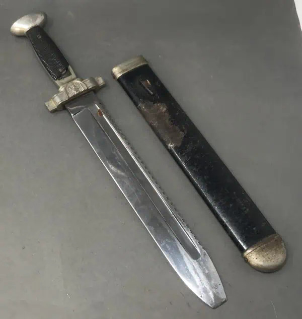 Original WWII German DRK RED CROSS HEWER. (DAGGER) (Seitengewehr mit Seitengewehrtasche) Brought Home By A U.S. Veteran Certified. The DRK, “Deutsches Rotes Kreuz” (German Red Cross), a voluntary civil assistance organization originally instituted in 1864, was officially acknowledged by the Geneva Convention in 1929, and in December of 1937 it was legally recognized by the NSDAP, becoming controlled by them a year later under the auspices of the Ministry of the Interior’s Social Welfare Organization. Due to its non-combatant status, it had to conform to the international Geneva Convention, which directed that its members not to carry any weapons, including edged weapons. As a result, the DRK Subordinate’s hewer, introduced in 1938, was designed with a squared tip to preclude its classification as a weapon, allowing its wear in the field. It was worn by the ranks of “DRK-Anwärter” to “DRK-Haupthelfer. The hewer features a roughly, 10 1/2″, (26.6 cm), long, broad, squared, blunt tipped, nickel/silver plated, drop forged, steel construction blade with deep, wide, fullers, a staggered, saw-toothed, edge, a large, flat, ricasso and a full length, including the hilt, of roughly, 15 5/8”, (39.6 cm). The blade is in good condition. The brown leather washer is still intact. The cast alloy construction, cross guard, languets, and pommel all have a matte, nickel/silver plated finish. The obverse, vertically oval, languet has a raised, smooth, outer edge encompassing an embossed first pattern, Gesh Gesch marked, DRK style national eagle with down-swept wings, a highly embossed swastika to its breast, and a traditional Greek style cross in its talons, on a slightly recessed, pebbled, field. This part is broken most likely from dropping it some where along the way (see photos priced accordingly) The reverse, vertically oval, languet also has the raised, smooth, outer edge encompassing a slightly recessed, smooth field. The short, horizontally extended, cross guard features two, evenly spaced, deeply recessed, horizontal, lines near both the top and bottom edges. The unique shaped, horizontally oval, integral, plain pommel is intact. The hewer has molded, black, bakelite grips held in place by two, countersunk screws. The obverse grip features a repeating, diamond grooved pattern and the reverse grip is plain. Some loss to the grips The hewer comes with its original, black painted magnetic sheet metal scabbard (some paint loss) with matte, nickel/silver plated top and bottom fittings. Both the top and bottom fittings are secured to the scabbard by two, small, dome headed screws. Nice. Brought back by a U.S. Solider. Good condition with some wear and storage age and expected issues. 100% Guaranteed to be authentic Complete Museum documentation (COA) Provided. Certified by The Gettysburg Museum of History. A nice starter version priced according to condition. Please see our other items. Also note when browsing our web site there are several pages of items, at the bottom of the list look for other page numbers. Priced according to condition.