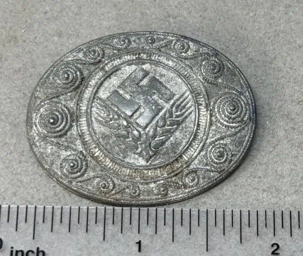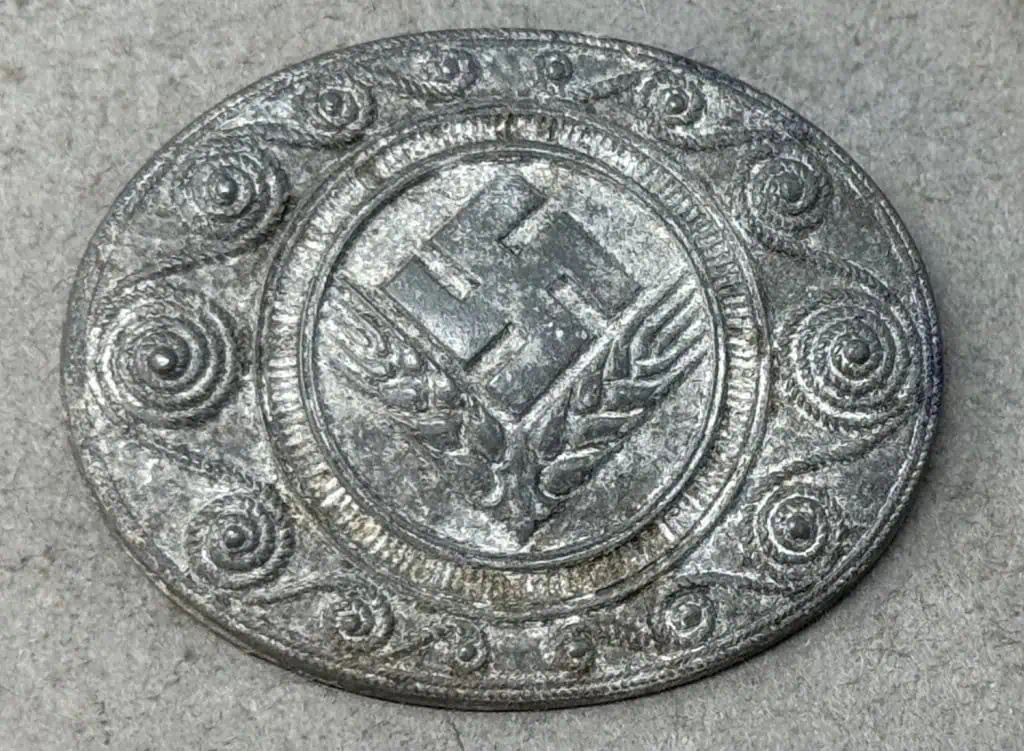 Original WWII German Female RADwJ Personal MEMBER BROOCH. (Dienstgradabzeichen) Certified. The female version of the male RAD, “Reichsarbeitsdienst” (National-labor-service), was originally established in February of 1933, and was considered a sub-section of the “National Sozialistisches Frauenschaft” (National Socialist Women’s’-organization). In April of 1936 the female labor service was dissociated with the NS Frauenschaft, and was given the official designation RADwJ, “Reichsarbeitsdienst der weiblichen Jugend” (National-labor-service for female Youth). The RADwJ was originally a voluntary organization, in spite of regulations of June, 1935, that dictated a six month mandatory service period. Actual conscription of RADwJ personnel began in August of 1936, but it wasn’t until September of 1939 that the mandatory six months service was enforced. Prior to its separation from the NS Frauenschaft, a series of rank brooches had been introduced and were worn until August of 1937, when a new series of rank brooches were introduced. The second pattern (1937) rank brooches were utilized until a third and final pattern was introduced in October of 1939. A finely detailed, 45mm wide and 35mm tall, horizontally oval, injection molded alloy brooch with a silver wash. The brooch features embossed stylized “rope” coils surrounding a central recessed, ribbed, circular field which encompassing an embossed, canted swastika flanked by embossed sheaths of wheat on a pebbled background field. Nicely maker marked . Nice used example showing the expected   but mild storage age and wear. 100% Guaranteed to be authentic.  Complete museum documentation (COA) Provided. Certified by The Gettysburg Museum of History. The Gettysburg Museum of History does not support or condone Adolf Hitler or the Nazi Party and is only offering this as a historic relic. Please see our other items.  Also note when browsing our web site there are several pages of items, at the bottom of the list look for other page numbers.  Don’t Miss It! ONE OF THE CLASSIC THIRD REICH FEMALE ARTIFACTS!