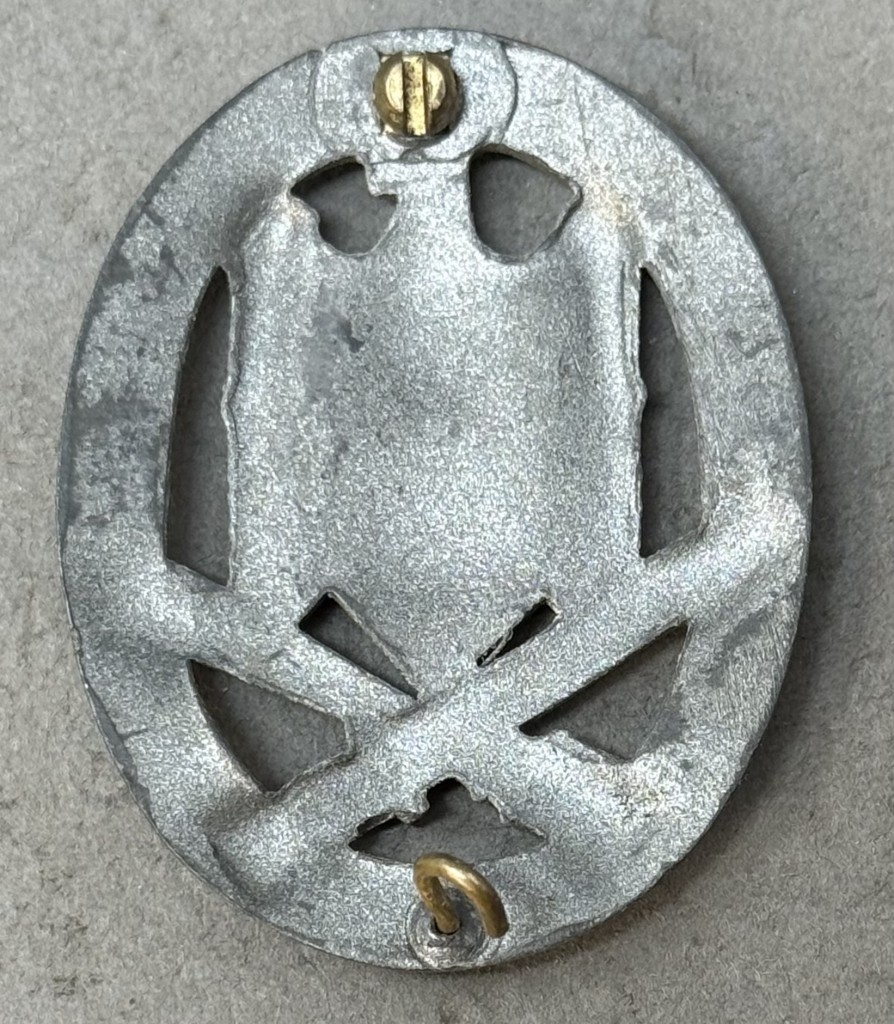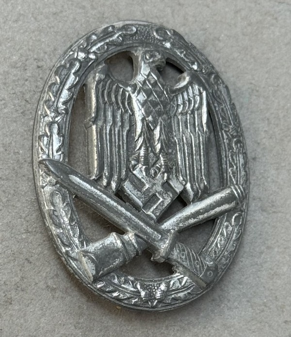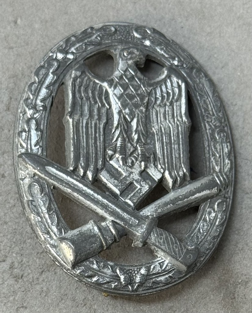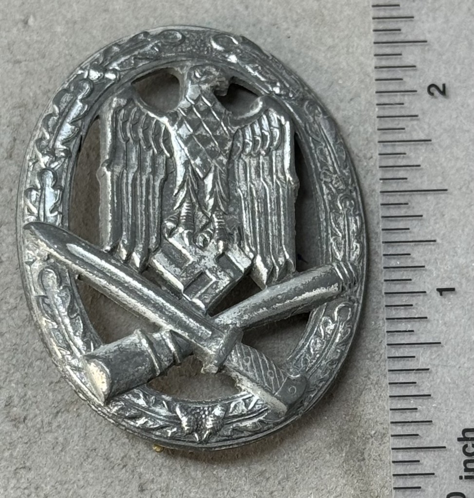 Original WWII German General Assault Badge Certified By The Gettysburg Museum Of History. The General Assault badge was introduced on June 1ST 1940, by Generaloberst Walther von Brauchitsch, for award to support personnel who were ineligible for the Infantry or Panzer Assault badges. Criteria for award of the badge was basically the same as the criteria for award of the Infantry and Panzer Assault badges with the main qualification being participation in three separate assaults in a supporting role. Die struck, solid backed, zinc construction award with a silver finish. The nicely detailed badge features a cut-out, high relief Wehrmacht styled eagle with down-swept wings positioned above a crossed bayonet and stick grenade, and encompassed by an embossed, vertically oval, oak-leaf wreath. Pin is missing (priced accordingly)  (see photos).  Complete museum documentation (COA) Provided. Certified by The Gettysburg Museum of History. The Gettysburg Museum of History does not support or condone Adolf Hitler or the Nazi Party and is only offering this as a historic relic. Please see our other items.   Also note when browsing our web site there are several pages of items, at the bottom of the list look for other page numbers. Don’t miss this . Has no pin .