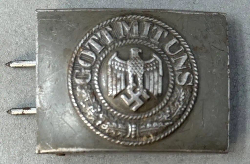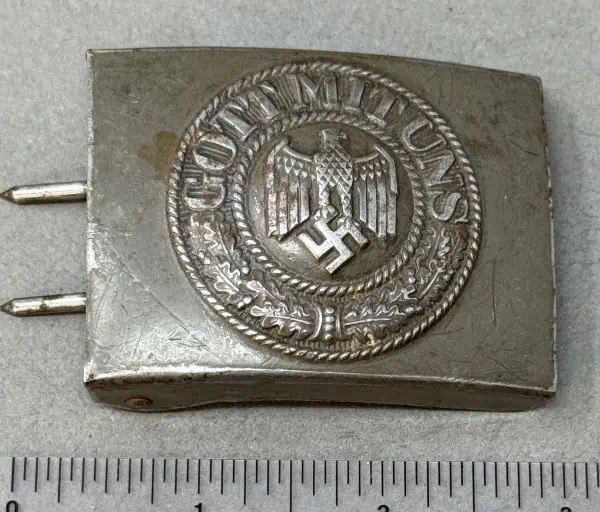 Original WWII German Combat Used Wehrmacht (Army) Belt Buckle Certified. 1940 pattern, field-grey painted, stamped steel construction, combat box buckle features a smooth outer field with a high relief, embossed Wehrmacht eagle with down swept wings to the slightly domed center, encompassed by an oak-leaf cluster to the bottom and script, “Gott Mit Uns”, (God With Us), to the top. The oak-leaf cluster and script are on a ribbed background and are encircled by both an inner and outer simulated twisted rope border. The reverse of the buckle is a mirror image of the obverse.  The reverse has the brazed buckle catch, prong bar and prongs all intact.  Complete museum documentation (COA) Provided. Certified by The Gettysburg Museum of History. The Gettysburg Museum of History does not support or condone Adolf Hitler or the Nazi Party and is only offering this as a historic relic. Please see our other items. Also note when browsing our web site there are several pages of items, at the bottom of the list look for other page numbers. Combat USED (see photos) with lots of original paint! OUTSTANDING!