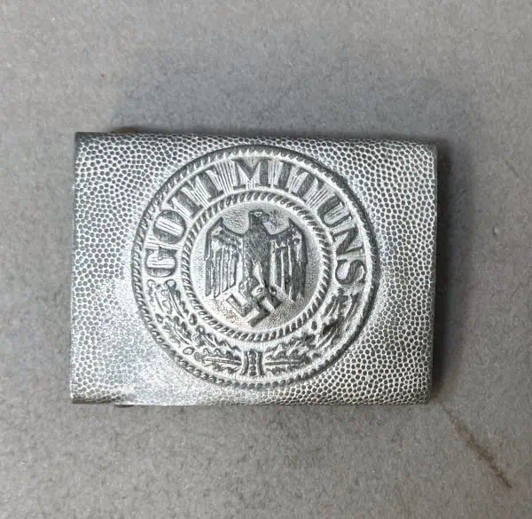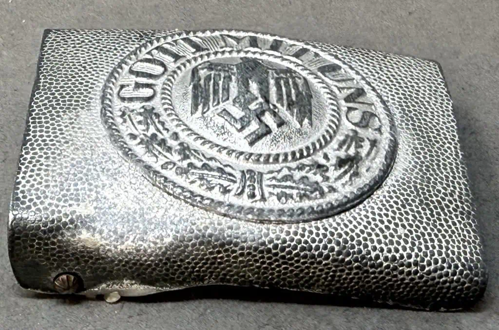 Original WWII German Wehrmacht (Army) Belt Buckle Certified. Early, (circa 1936-1940), 2-piece construction, steel box buckle with a pebbled background field and a slightly domed, embossed central motif. The central motif features an embossed Wehrmacht style eagle with down swept wings on a subtly pebbled field to the center, encompassed by an embossed oak-leaf cluster to the bottom and script, “Gott Mit Uns”, (God with Us), to the top. The oak-leaf cluster and script are on a ribbed background field and are encircled by both an inner and outer simulated twisted rope border. The reverse has the integral, raised, slotted buckle catch and separate prong bar and prongs all intact. A good example. Complete museum documentation (COA) Provided. Certified by The Gettysburg Museum of History. The Gettysburg Museum of History does not support or condone Adolf Hitler or the Nazi Party and is only offering this as a historic relic. Please see our other items. Also note when browsing our web site there are several pages of items, at the bottom of the list look for other page numbers. Nice, EARLY STYLE! OUTSTANDING BELT BUCKLE!