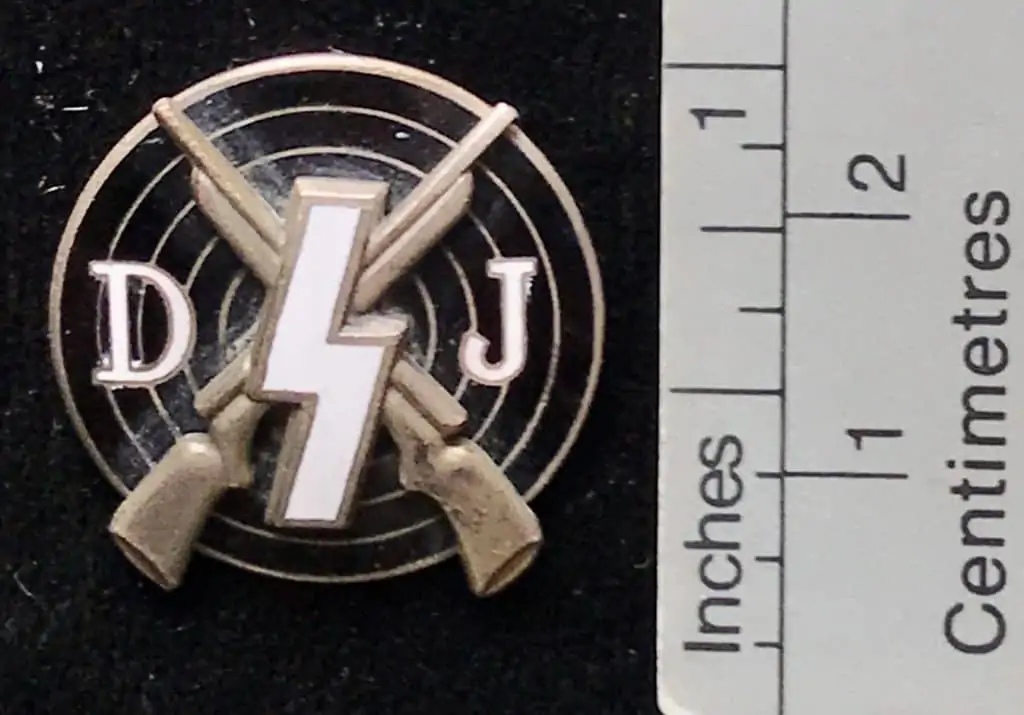 Original WWII German Hitler Youth DJ MARKSMAN’S BADGE. (DJ Schützen-Abzeichen) Certified. In 1936, “Reichsjugendführer” Baldur von Schirach established a Hitler Youth Firearms School in Obermatzfeld, Thuringia, to stimulate expertise in firearm handling and to further the para-military training of the HJ. Shortly after the establishment of this School, von Schirach instituted a Marksman’s badge for HJ members who had proven their proficiency with firearms, which was followed in 1938 by the establishment of a Sharpshooter’s badge for the HJ and a new Marksman’s badge for the DJ, with each badge having different award criteria. The Hitler Youth Marksman’s badge, the first and lowest class badge, was awarded to qualifying members over the age of fourteen for proficiency in target shooting with small caliber rifles. To qualify, the accurate results of five shots fired from a unsupported prone position, five shots from a supported prone position, and five shots from an unsupported kneeling position were required. The DJ badge was awarded to members under the age of 14 with the use of air rifles instead of a regular .22 caliber rifle. A approximately 22mm diameter, convex alloy badge, whose obverse features four concentric silver-washed rings against a black enamel background, to the center of which is affixed the single DJ sigrune, with crossed, silver-washed rifles behind it. The 9mm tall sigrune is in white enamel with a silver border. A horizontal pin-back device is crimped to a circular plate soldered to its reverse. Above the plate is embossed an RZM, “Reichszeugmeisterei” (National-material-control-office), logo and “M1/123”, for Hans Müller, Stuttgart. One of the classic Hitler Youth insignia from the third Reich in used condition. Typical light age toning plus wear during use. Nice example issued with expected age condition issues. Gettysburg Museum Certified (COA) provided. Rare 100% Guaranteed to be authentic. Sold for historic purposes only. See our other pieces on our web site. Also note when browsing our web site there are several pages of items, at the bottom of the list look for other page numbers. One of the classic badges, GREAT LOOKING VERY RARE BADGE.