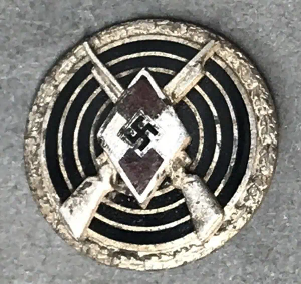 Original WWII German Hitler Youth HJ SHARPSHOOTER BADGE. (HJ Schützen-Abzeichen) Certified. In 1936 Reichsjugendführer Baldur von Schirach established a HJ Firearms School in Obermatzfeld Thuringia to stimulate expertise in firearm handling and to further the para-military training of the HJ. Shortly after the establishment of the HJ Firearms School von Schirach instituted a Marksman’s badge for HJ members who had proven their proficiency with firearms, followed in 1938 by the establishment of a Sharpshooters badge for HJ members and a new Marksman’s badge for DJ members with each badge having different award criteria. The HJ Marksman’s badge, the first and lowest class badge, was awarded to qualifying HJ members over the age of fourteen for proficiency in target shooting, with small caliber rifles. Qualification for bestowal of the badge consisted of the accurate results of five shots fired from a unsupported prone position, five shots from a supported prone position and five shots from a unsupported kneeling position. Of Note: The series of HJ shooting badges was further expanded with the introduction of a Master Shooters badge in December 1941. The criteria for award of the Sharpshooters badge and the Master Shooters badge required ten shots in each of the same three positions as the Marksman’s badge but with a higher degree of accuracy. Roughly 27mm diameter, slightly convexed, two piece, die stuck alloy construction badge with a multi-colored enamel and nickel/silver plated finish. Badge features a recessed, embossed outer oak-leaf wreath encompassing four concentric “target” rings on a black enamel background field with a separate, raised, HJ diamond superimposed over crossed rifles affixed rivetted to the center. The HJ diamond features semi-translucent red enamel field to top and bottom quarters and white enamel fields to the side quarters, with a central black canted enamel swastika. Reverse of the badge is well marked with embossed RZM logo with dual circular borders and manufacturers code, “M1/102” indicating manufacture by Frank & Reif Stuttgart. Badge is complete with its original combined pin and catch assembly intact to reverse. Of Note: From its institution in 1938 until the end of 1943 it is alleged that 31,904 Sharpshooter Badges were awarded. Also Of Note: The series of HJ shooting badges was expanded with the introduction of a Master Shooters Badge in December 1941. This higher class badge required ten shots in each of the same four positions as the Sharpshooters badge but with a higher degree of accuracy. One of the classic Hitler Youth insignia from the third Reich in used condition. Typical light age toning plus wear during use. Nice example issued with expected  age condition issues. Gettysburg Museum Certified (COA) provided. Rare 100% Guaranteed to be authentic. Sold for historic purposes only. See our other pieces on our web site.    Also note when browsing our web site there are several pages of items, at the bottom of the list look for other page numbers. One of the classic badges, GREAT LOOKING  RARE BADGE.