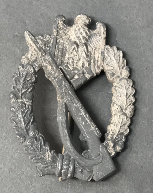 Original WWII German Infantry Assault Badge In Silver Certified By The Gettysburg Museum Of History. The Infantry Assault Badge in silver was introduced on December 20TH 1939 by Generaloberst Walther von Brauchitsch, for award to Officers, and EM/NCO’s of non-motorized, Infantry and Mountain Infantry units. Criteria for the award varied, with the main qualification being participation in three separate Infantry assaults. Of Note: On June 1ST 1940 a bronze version of the Infantry Assault Badge was introduced for award to Officer’s, and EM/NCO’s of Motorized Infantry units. Original Infantry Assault Badge, made of solid zinc with silver wash which has some attractive age toning. The reverse of this Infantry Assault Badge is a rare semi hollow backed version. The hardware setup is typical for this maker, with a crimped in hinge and catch, and a round wire pin. The catch is intact and works perfectly. (see photos) This badge remains in very good overall GOOD condition with some age patina! Complete museum documentation (COA) Provided. Certified by The Gettysburg Museum of History. The Gettysburg Museum of History does not support or condone Adolf Hitler or the Nazi Party and is only offering this as a historic relic. Please see our other items. Also note when browsing our web site there are several pages of items, at the bottom of the list look for other page numbers. VERY GOOD CONDITION Some silver wash left VERY NICE semi hollow Backed!