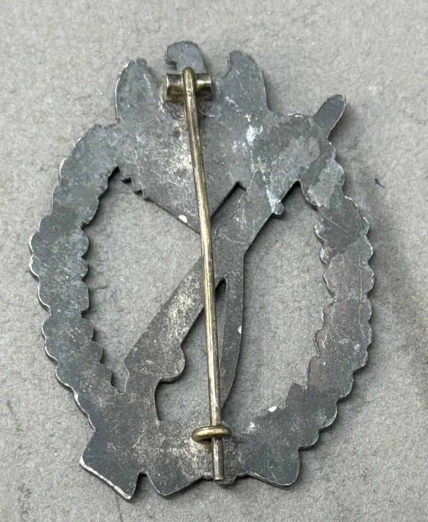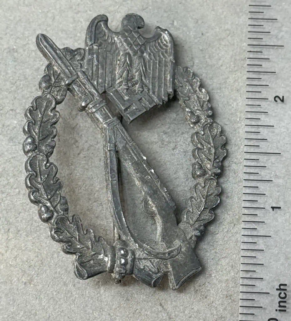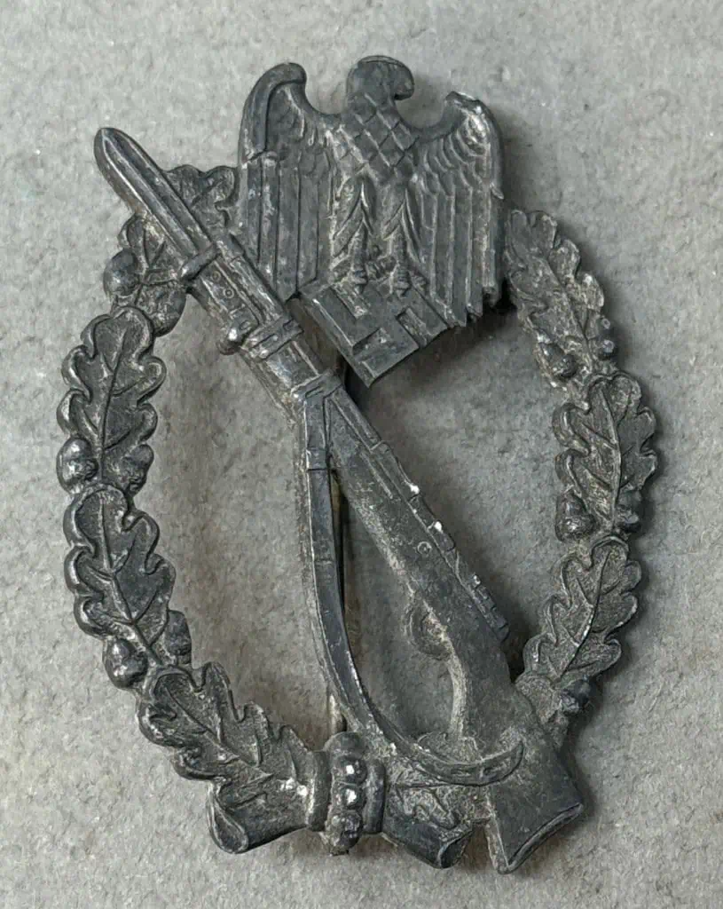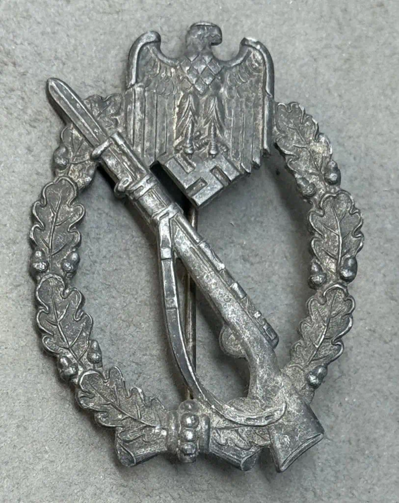 Original WWII German Infantry Assault Badge In Silver Certified By The Gettysburg Museum Of History. The Infantry Assault Badge in silver was introduced on December 20TH 1939 by Generaloberst Walther von Brauchitsch, for award to Officers, and EM/NCO’s of non-motorized, Infantry and Mountain Infantry units. Criteria for the award varied, with the main qualification being participation in three separate Infantry assaults. Of Note: On June 1ST 1940 a bronze version of the Infantry Assault Badge was introduced for award to Officer’s, and EM/NCO’s of Motorized Infantry units. Original Infantry Assault Badge, made of solid zinc with silver wash which has some attractive age toning. The reverse of this Infantry Assault Badge is solid backed The hardware setup is typical for this maker, with a crimped in hinge and catch, and a round wire pin. The catch is intact and works (see photos) This badge remains in very good overall GOOD condition with some slight age patina! Complete museum documentation (COA) Provided. Certified by The Gettysburg Museum of History. The Gettysburg Museum of History does not support or condone Adolf Hitler or the Nazi Party and is only offering this as a historic relic. Please see our other items. Also note when browsing our web site there are several pages of items, at the bottom of the list look for other page numbers. VERY GOOD CONDITION OUTSTANDING EXAMPLE!