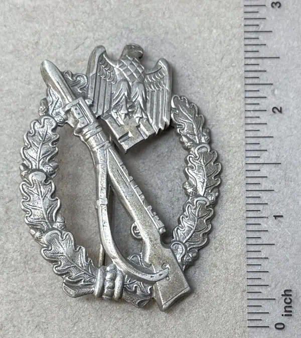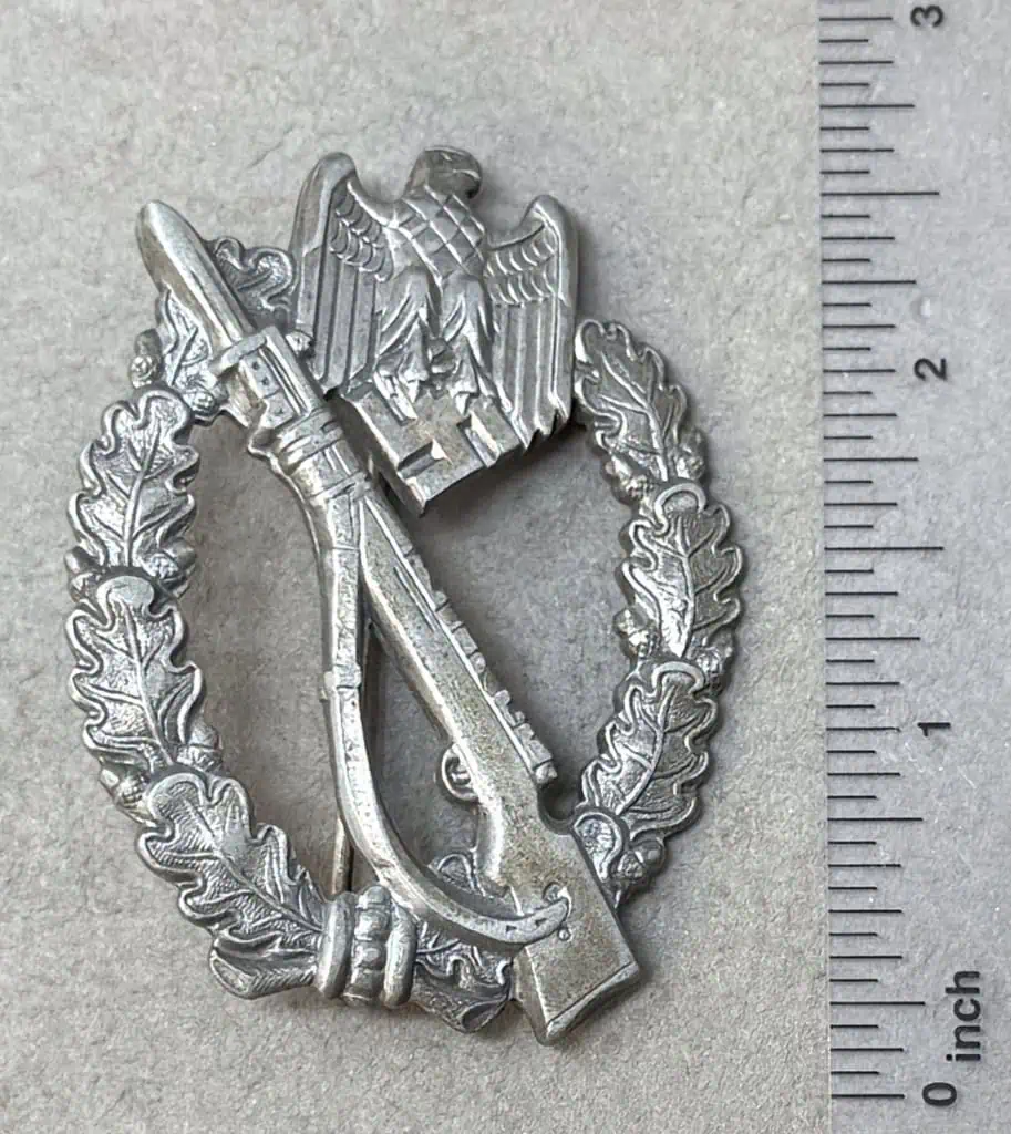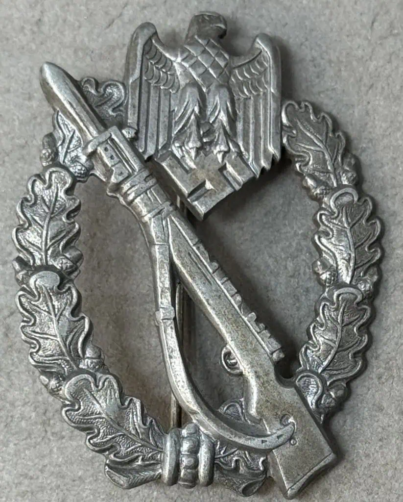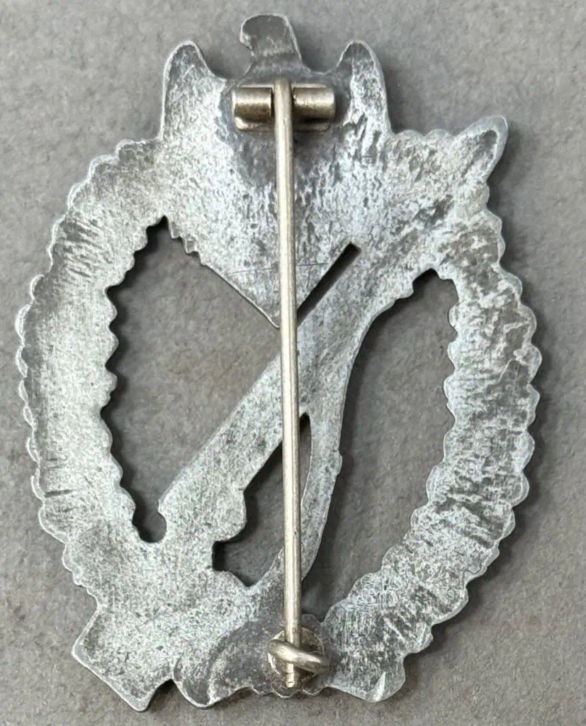 Original WWII German Infantry Assault Badge In Silver Certified By The Gettysburg Museum Of History. The Infantry Assault Badge in silver was introduced on December 20TH 1939 by Generaloberst Walther von Brauchitsch, for award to Officers, and EM/NCO’s of non-motorized, Infantry and Mountain Infantry units. Criteria for the award varied, with the main qualification being participation in three separate Infantry assaults. Of Note: On June 1ST 1940 a bronze version of the Infantry Assault Badge was introduced for award to Officer’s, and EM/NCO’s of Motorized Infantry units. Original Infantry Assault Badge, made of solid zinc with silver wash which has some attractive age toning. The reverse of this Infantry Assault Badge is solid backed The hardware setup is typical for this maker, with a crimped in hinge and catch, and a round wire pin. The catch is intact and works (see photos) This badge remains in very good overall GOOD condition with some slight age patina! Complete museum documentation (COA) Provided. Certified by The Gettysburg Museum of History. The Gettysburg Museum of History does not support or condone Adolf Hitler or the Nazi Party and is only offering this as a historic relic. Please see our other items. Also note when browsing our web site there are several pages of items, at the bottom of the list look for other page numbers. VERY GOOD CONDITION OUTSTANDING EXAMPLE!