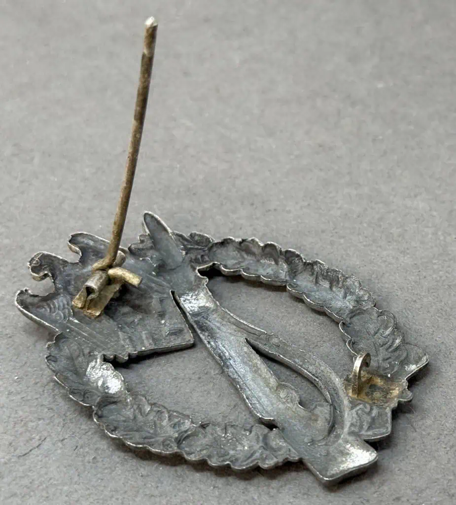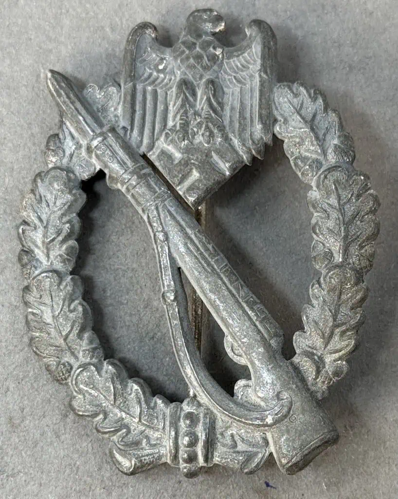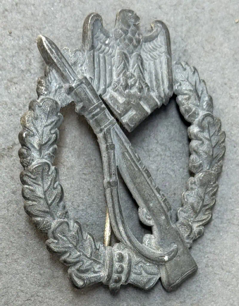 Original WWII German Infantry Assault Badge In Sliver Certified By The Gettysburg Museum Of History. The Infantry Assault Badge in silver was introduced on December 20TH 1939 by Generaloberst Walther von Brauchitsch, for award to Officers, and EM/NCO’s of non-motorized, Infantry and Mountain Infantry units. Criteria for the award varied, with the main qualification being participation in three separate Infantry assaults. Of Note: On June 1ST 1940 a bronze version of the Infantry Assault Badge was introduced for award to Officer’s, and EM/NCO’s of Motorized Infantry units. Die struck, hollowed backed, zinc construction badge with a silver washed finish features an embossed, vertically oval, oak-leaf wreath with a Wehrmacht style eagle with down-swept wings, clutching a canted swastika in its talons, superimposed to the top center, encompassing a cut-out, bolt action, rifle with a fixed bayonet and a sling. The reverse should have a crimped, soldered hinge, a thin, round, vertical, pin and a soldered catch are present. Rare hollow back version! in good condition some of it’s original silver wash still present!. Complete Museum documentation (COA) Provided. Certified by The Gettysburg Museum of History. The Gettysburg Museum of History does not support or condone Adolf Hitler or the Nazi Party and is only offering this as a historic relic. Please see our other items. Also note when browsing our web site there are several pages of items, at the bottom of the list look for other page numbers. Good CONDITION VERY NICE.