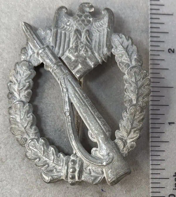 Original WWII German Infantry Assault Badge In Sliver Certified By The Gettysburg Museum Of History. The Infantry Assault Badge in silver was introduced on December 20TH 1939 by Generaloberst Walther von Brauchitsch, for award to Officers, and EM/NCO’s of non-motorized, Infantry and Mountain Infantry units. Criteria for the award varied, with the main qualification being participation in three separate Infantry assaults. Of Note: On June 1ST 1940 a bronze version of the Infantry Assault Badge was introduced for award to Officer’s, and EM/NCO’s of Motorized Infantry units. Die struck, hollowed backed, zinc construction badge with a silver washed finish features an embossed, vertically oval, oak-leaf wreath with a Wehrmacht style eagle with down-swept wings, clutching a canted swastika in its talons, superimposed to the top center, encompassing a cut-out, bolt action, rifle with a fixed bayonet and a sling. The reverse should have a crimped, soldered hinge, a thin, round, vertical, pin and a soldered catch are present. Rare hollow back version! in good condition some of it’s original silver wash still present!. Complete Museum documentation (COA) Provided. Certified by The Gettysburg Museum of History. The Gettysburg Museum of History does not support or condone Adolf Hitler or the Nazi Party and is only offering this as a historic relic. Please see our other items. Also note when browsing our web site there are several pages of items, at the bottom of the list look for other page numbers. Good CONDITION VERY NICE.