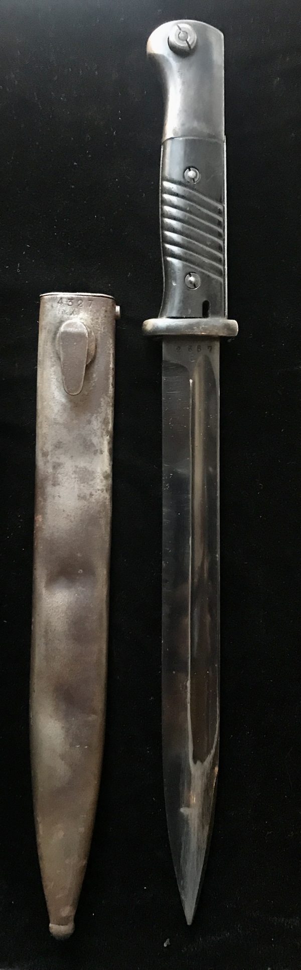 Original WWII German K98 COMBAT BAYONET. (Seitengewehr 98K) Brought Home By A U.S. Veteran Certified. The K98 bayonet was a modification of the already modified S84/98 bayonet that had been originally developed in 1915. Manufacture of this new modified bayonet began in 1934 with mass production beginning in 1936. The K98 bayonet was a standard issue item and was accompanied by a bayonet frog to be worn on the reverse left side of the weight bearing waist belt. The K98 bayonet remained the standard issue bayonet through-out the war with minor manufacturing variations. As the war continued the quality of the bayonets deteriorated and in mid-1944 most manufacturers discontinued producing the bayonet to concentrate on producing other essential war materials. Roughly 25cm long, drop forged, steel construction blade with wide fullers. Maker marked with numbers. Scabbard and blade has typical combat used look. Nice Bakelite grip. Stud does move and functions properly. Excellent blade with lots of original bluing still present. Some loss to the finish on the scabbard. Some dents in the scabbard from field use. dated 1942 Over all great example. 100% Guaranteed to be authentic Complete museum documentation (COA) Provided. Certified by The Gettysburg Museum of History. Please see our other items. Also note when browsing our web site there are several pages of items, at the bottom of the list look for other page numbers. OUTSTANDING Combat Used! Do Not Miss This One!