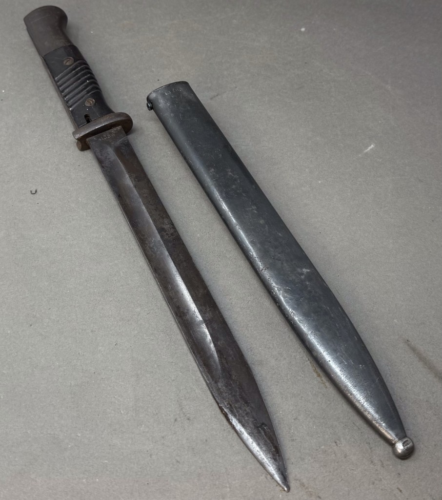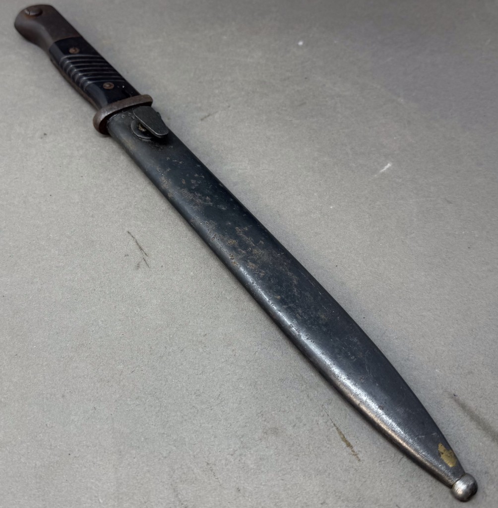 Original WWII German K98 COMBAT BAYONET. (Seitengewehr 98K)  Certified. The K98 bayonet was a modification of the already modified S84/98 bayonet that had been originally developed in 1915. Manufacture of this new modified bayonet began in 1934 with mass production beginning in 1936. The K98 bayonet was a standard issue item and was accompanied by a bayonet frog to be worn on the reverse left side of the weight bearing waist belt. The K98 bayonet remained the standard issue bayonet through-out the war with minor manufacturing variations. As the war continued the quality of the bayonets deteriorated and in mid-1944 most manufacturers discontinued producing the bayonet to concentrate on producing other essential war materials. Roughly 25cm long, drop forged, steel construction blade with wide fullers. Scabbard and blade have typical combat used look.  Nice bakelite grip. Stud does move and functions properly Almost no  loss to the finish blade. VERY NICE!   The scabbard in good but used from field use condition.  Overall great example.  100% Guaranteed to be authentic Complete museum documentation (COA) Provided. Certified by The Gettysburg Museum of   History.   Please see our   other items.  Also note when browsing our web site there are several pages of items, at the bottom of the list look for other page numbers. OUTSTANDING Combat Used! Do Not Miss This One!