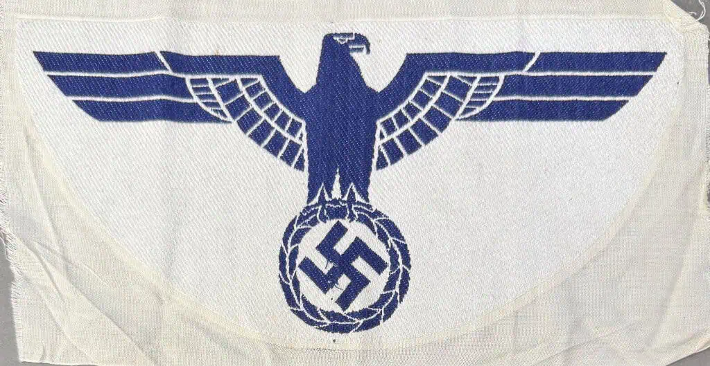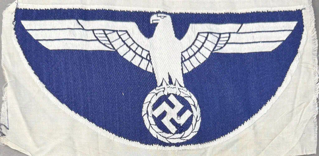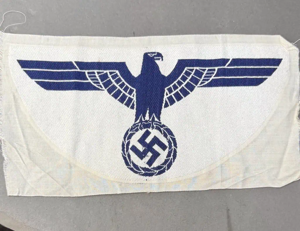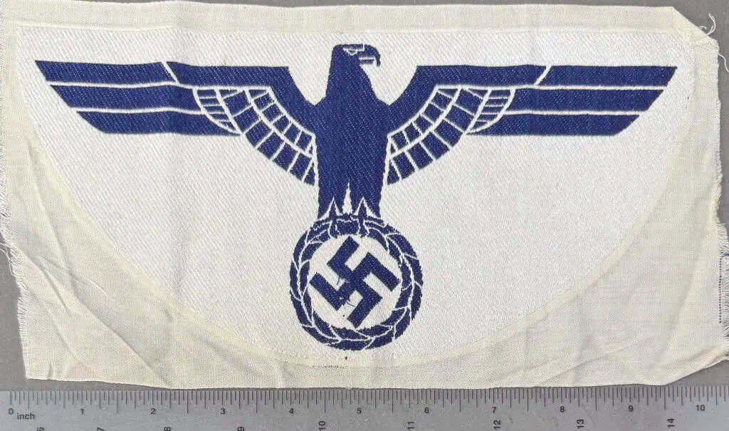 Original WWII German Kreigsmarine (Navy) M35 SPORT SHIRT EAGLE. (Wehrmachtsportabzeichen) Certified. The Kriegsmarine, (War Navy), adopted a slightly modified version of the NSDAP’s, Nationalsozialistische Deutsche Arbeiterpartei, (National Socialist German Worker’s Party), national eagle for wear on the front of the headgear and the right breast of the uniform on March 24TH 1934. Physical fitness of its personnel was a prime concern of the German Wehrmacht, (Armed Forces), including the navy, and each new recruit was issued a specific sport uniform that consisted of a pullover “tank top” style shirt, navy blue or white shorts, athletic shoes and a two piece “sweat suit” type sports uniform. Originally Kriegsmarine personnel wore a fouled anchor insignia on their sports shirts until regulations of August 25TH 1932 introduced a Unit Sports Badge, of an unknown design, that was to be applied to the front center of the sports shirt. On May 3RD 1935 the M35 sports shirt eagle for EM/NCO’s was introduced to replace the previously used Weimar era Reichsmarine, (National Navy, circa 1919-1933), Unit Sports Badge. Of Note: Following the Kriegsmarine’s lead, on May 14TH 1935 the Army introduced the M35 sports shirt eagle for EM/NCO’s, to replace the previously used Weimar Reichswehr era, (National Defence Force, circa 1919-1933), Troop Sports Badge. The army’s version of the M35 sports shirt eagle was identical to the Kriegsmarine’s except for coloration, with the army utilizing black eagles while the Kriegsmarine utilized cornflower blue eagles. Cornflower blue, machine woven, national eagle, with out-stretched wings, clutching a wreathed, canted, swastika in its talons, to the center. 24cm wingspan. Typical storage wear, good condition. Complete museum documentation (COA) Provided. Certified by The Gettysburg Museum of History. 100% guaranteed to be authentic. The Gettysburg Museum of History does not support or condone Adolf Hitler or the Nazi Party and is only offering this as a historic relic. Please see our other items. Also note when browsing our web site there are several pages of items, at the bottom of the list look for other page numbers. NICE BIG EAGLE! The Navy blue version is the rarest eagle of the branches.