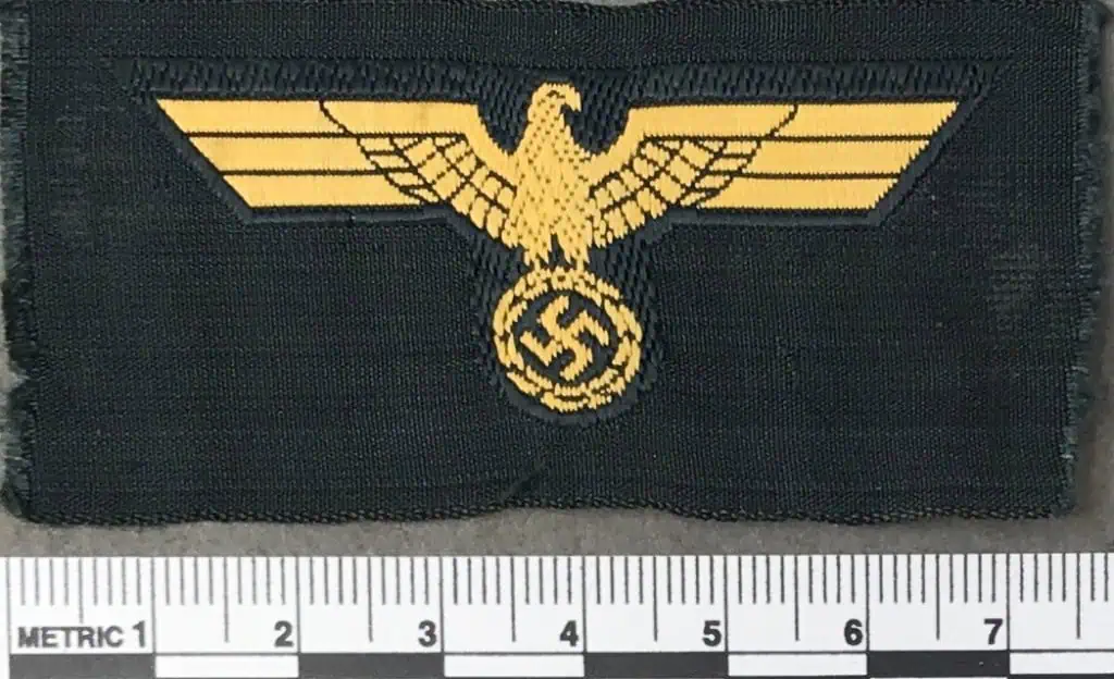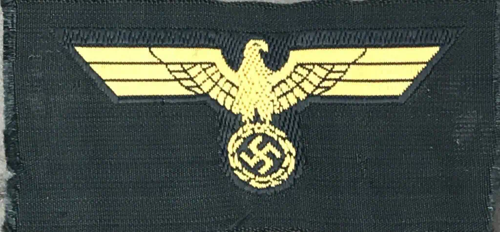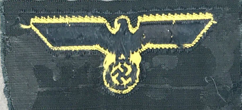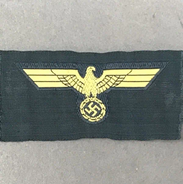 Original WWII German Kriegsmarine (Navy) CAP Eagle Coastal Artillery Brought Home By A U.S. Solider Certified. The Kriegsmarine adopted wear of the new national eagle on the front of the headgear and the right breast of the uniform on March 24TH 1934. The Kriegsmarine’s version of the national eagle was identical to the army version except for the coloration with the army utilizing silver, white and grey eagles while the Kriegsmarine utilized golden yellow eagles. Of Note: The only exceptions in the coloration of the Kriegsmarine eagle were that personnel serving in the administrative branch utilized a silver eagle while eagles worn on the white jumper shirts were in cornflower blue. Due to the silver insignia the administrative personnel were contemptuously referred to as Silberlinge, (Silvered Ones). Beginning in 1935 Kriegsmarine land-based personnel, primarily Coastal Artillery units, were issued field-grey uniforms and headgear that followed the fundamental designs of the army uniforms and headgear with minor variations. The cap eagles for the field-grey headgear were basically the same as the standard cap eagles but were worked on different colored backgrounds. The early produced breast eagles were on a dark blue/green base while later production models were on a field-grey base. Later, machine woven national eagle with out-stretched wings clutching a wreathed, canted, swastika in it’s talons, in golden yellow rayon threads on a woven field-grey rayon base. Nice example with expected used U.S. Veteran bring-back condition. Scarce in such good condition. Gettysburg Museum Certified (COA) provided. Rare 100% Guaranteed to be authentic pre-1945. Sold for historic purposes only. See our other pieces on our web site. Also note when browsing our web site there are several pages of items, at the bottom of the list look for other page numbers. Later Green/Back background!!
