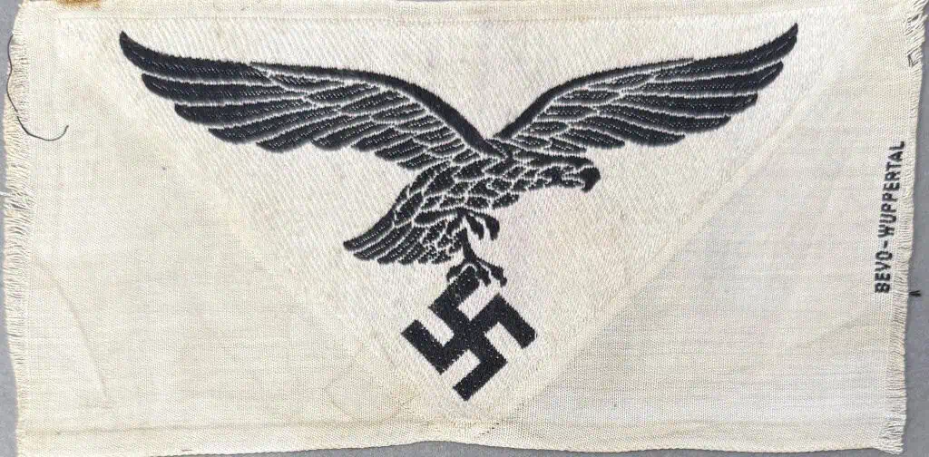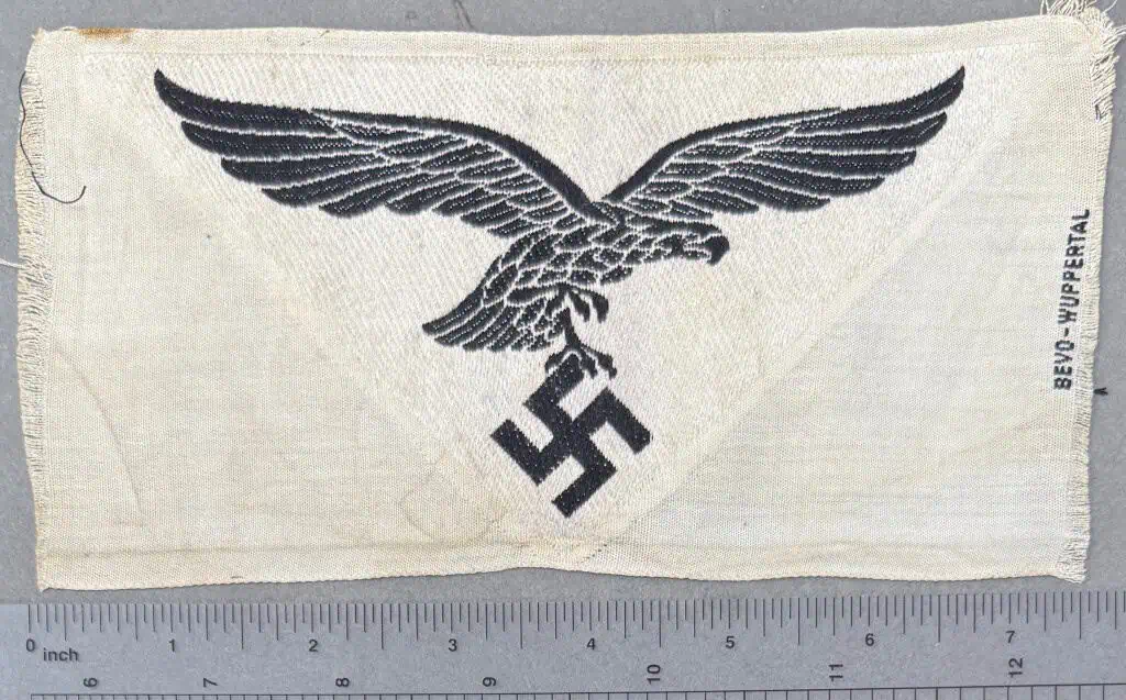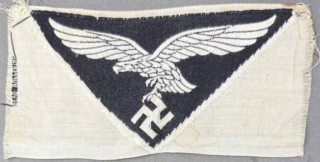 Original WWII German Luftwaffe (Airforce) M-35 Sports Shirt Eagle Brought Home By A U.S. Veteran Certified. Physical fitness of its personnel was a prime concern of the German Wehrmacht, (Armed Forces), and each new recruit was issued a specific sport uniform that consisted of a white pullover “tank top” style shirt, navy blue shorts, black or green swim trunks and athletic shoes. Additional sportswear was optional. The Luftwaffe pattern national eagle was originally introduced for wear by Fliegerschaft personnel on August 18TH 1934, and adopted for wear by the Luftwaffe on March 1ST 1935. The first pattern national eagle was utilized until a modified second pattern eagle was introduced in late 1936 or early 1937. The sports shirt eagle was introduced on July 4TH 1935 to be worn on the front center of the sports shirt. Of Note: NCO ranks were identified by the addition of a black stripe around the neck of the sports shirt. The insignia consists of a roughly, 9cm x 16cm wide, woven, white, rayon, inverted triangular base with a black, machine woven, second pattern, (circa 1936/1937-1945), Luftwaffe eagle, with out-stretched wings to the center. The eagles wingspan is roughly, 14cm wide from tip to tip. (see photos) Typical storage wear, good condition. Complete museum documentation (COA) Provided. Certified by The Gettysburg Museum of History. 100% guaranteed to be authentic. The Gettysburg Museum of History does not support or condone Adolf Hitler or the Nazi Party and is only offering this as a historic relic. Please see our other items. Also note when browsing our web site there are several pages of items, at the bottom of the list look for other page numbers. A NICE EAGLE! GOOD CONDTION!