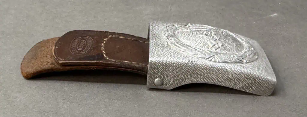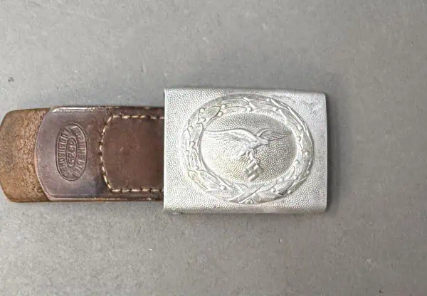 Original WWII German Luftwaffe (Airforce) EM/NCO’S BELT BUCKLE. (Koppelschloß) With Leather Tab Brought Home By A U.S. Veteran Certified. Military belts and their corresponding buckles date back centuries and were initially designed for attaching swords and daggers. In 1847 a new innovative box buckle with a quick release catch and corresponding belt were introduced which resulted in a Prussian, Hauptmann Virschow, initiating a new method of carrying personal equipment with the belt and shoulder straps supporting the majority of the weight. This system, with modifications, remains in use in most of the armies in the world to this day. During the Third Reich there was a prescribed form of wear of the belt and buckle with the buckle being positioned on the right side and the corresponding buckle catch on the left side. First introduced on May 20TH 1935, the Luftwaffe EM/NCO’s belt buckle underwent minor modifications in late 1937 or early 1938 with a new pattern eagle and again in 1940 with a slight difference in construction. Of Note: Luftwaffe personnel initially utilized brown leather accoutrements but during the war the leather items were generally blackened. Also Of Note: Originally military buckles produced under government contract had the addition of a leather, (canvas web for tropical buckles), tabs which were designed to help support the ammunition pouches and prevent slippage but regulations in 1942 discontinued the tabs to preserve leather although the directive was not completely adhered to. Early, 1935 pattern, die stamped, aluminum construction box buckle features a pebbled outer field with a central, embossed, high relief, horizontally oval laurel leaf wreath encompassing a slightly domed, pebbled inner field with an embossed,  Luftwaffe eagle with out-stretched wings, clutching a canted swastika in its talons, to the center. The reverse of the buckle is a mirror image of the obverse and the brazed buckle catch, prong bar and prongs are all intact. The buckle has very nice visible manufacturer’s markings (see photos). Still has the original leather tab with maker and 1939 date! Typical use wear, good combat worn condition. (see photos) Complete Museum documentation (COA) Provided. Certified by The Gettysburg Museum of History. 100% guaranteed to be authentic. The Gettysburg Museum of History does not support or condone Adolf Hitler or the Nazi Party and is only offering this as a historic relic. Please see our other items.    Also note when browsing our web site there are several pages of items, at the bottom of the list look for other page numbers. OUTSTANDING EARLY MAKER MARKED EXAMPLE!