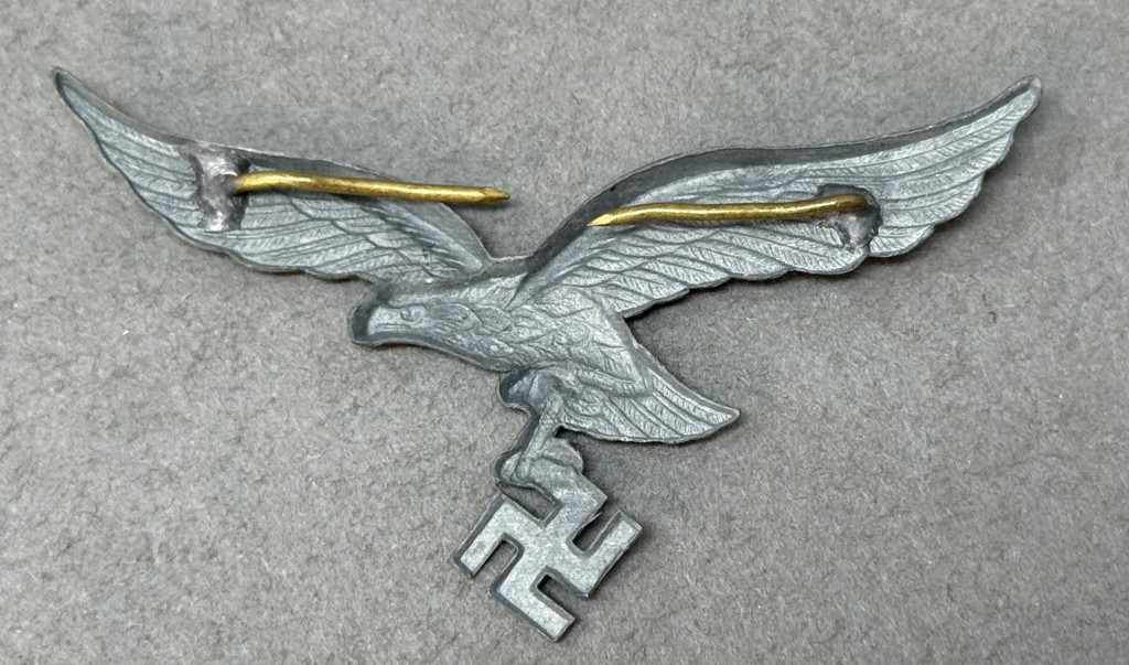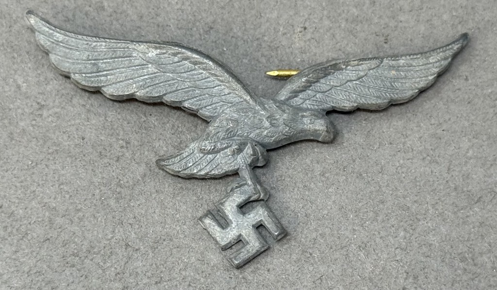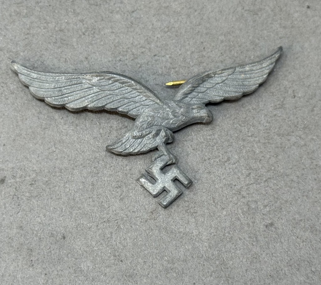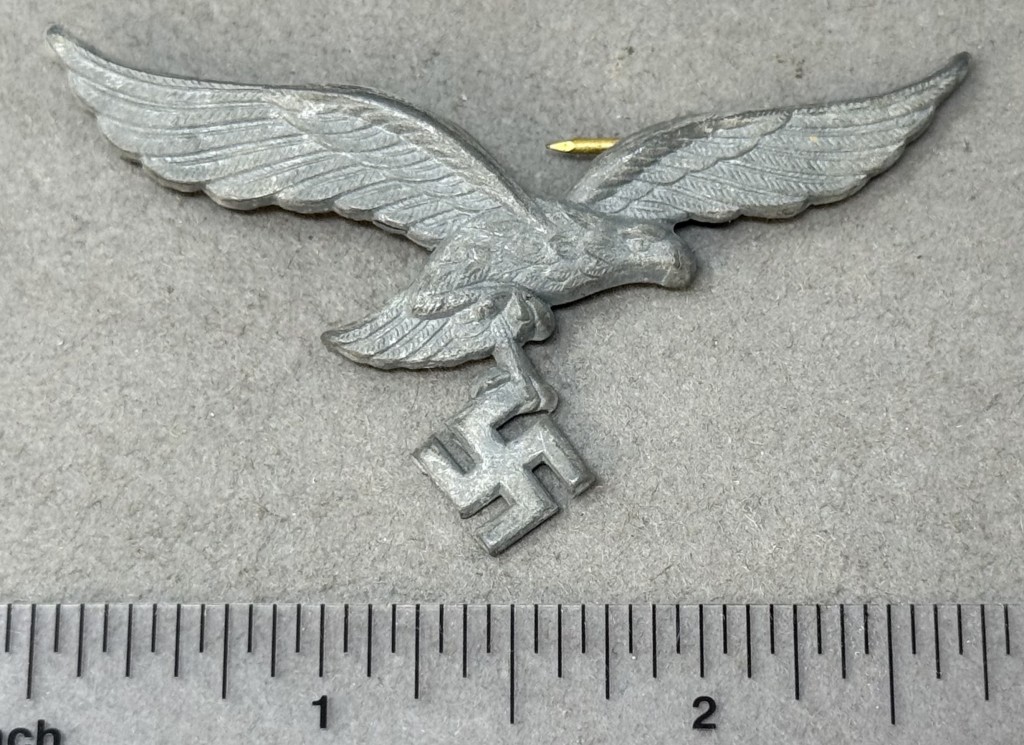 Original WWII German Luftwaffe (Airforce) EM/NCO’S VISOR CAP EAGLE Brought Home By A U.S. Soldier Certified. The Luftwaffe pattern national eagle was originally introduced for wear by Fliegerschaft, (Pilot Base), personnel of the DLV, Deutscher Luftsportsverband, (German Air Sports Association), the clandestine, civilian, forerunner of the Luftwaffe on August 18TH 1934 and was officially adopted for wear by all Luftwaffe personnel on March 1ST 1935. The original, short winged, first pattern national eagle was utilized until a, slightly modified, second pattern national eagle was introduced in late 1936 or early 1937. Regulations dictated that the national eagle was to be worn on almost all headgear and on the right breast of almost all uniforms with a few minor exceptions. Officer’s ranks generally utilized hand embroidered national eagles as opposed to the machine embroidered breast and cap eagles or stamped metal visor cap eagles as utilized by EM/NCO ranks. Of Note: Machine woven national eagles were also utilized in limited quantities. Also Of Note: Officer holding ranks of Generalmajor to Generalfeldmarschall and Reichsmarschall Göring utilized gold colored accoutrements including visor cap eagles as opposed to the silver version sworn by all other ranks. Nicely detailed die struck, aluminum construction, second pattern, (Circa 1936/1937-1945), Luftwaffe eagle with out-stretched wings, clutching a canted swastika in one talon. The reverse of the eagle has two attachment prongs intact! Excellent example. Nice untouched eagle. Nice example showing the expected minor age and wear overall good condition. Gettysburg Museum Certified (COA) provided. 100% Guaranteed to be authentic brought home by a U.S. Veteran. Sold for historic purposes only. See our other pieces on our web site. Also note when browsing our web site there are several pages of items, at the bottom of the list look for other page numbers. Great artifact! don’t miss it! OUTSTANDING CAP EAGLE VERY GOOD CONDITION! (see photo)