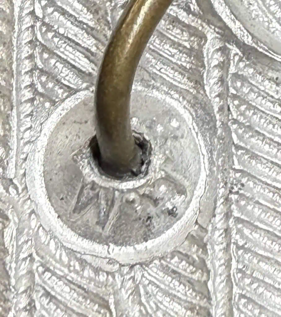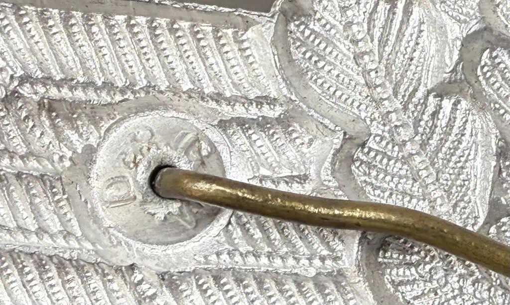 Original WWII German Luftwaffe (Airforce) VISOR CAP WREATH & COCKADE. (Schirmmütze Eichenlaubkranz und Korkade) Certified. On its inception on February 26TH 1935, the Luftwaffe adopted most of the uniform items of the earlier DLV, Deutscher Luftsport Verband, (German Air Sports League), its clandestine, civilian forerunner, including the visor cap. In March 1935 the earlier, “Tellerform”, saucer shaped, caps were replaced with a new, “Sattelform” cap with a higher front peak and an oval shaped top. Along with the introduction of the “Sattelform” cap a new winged wreath and national tri-color cockade were also introduced and were utilized until the end of the war. Officer’s ranks generally utilized hand embroidered visor cap insignia as opposed to the stamped metal visor cap insignia as utilized by EM/NCO ranks. Company and Field grade Officer’s caps were distinguished from the EM/NCO’s caps by bright silver/aluminum piping and a silver/aluminum chin cord while General Officer’s ranks from Generalmajor to Reichsmarschall inclusively, utilized gold colored visor cap fittings. Single piece, silver washed, die stamped, aluminum construction winged visor cap wreath with a painted national tri-color cockade. The winged, open topped, wreath features four, horizontally extended, “wings” emanating from the central oak-leaf wreath that encompasses the national tri-color cockade. The wreath and wings both have finely embossed detailing. The cockade features a ribbed, circular black outer ring encompassing a ribbed, silver inner ring and a smooth red centerpiece. The reverse of the insignia is a mirror image of the obverse and both attachment prongs with raised, crimped, retaining lips are intact. Nice example showing the expected minor age and wear In good but used condition. Gettysburg Museum Certified (COA) provided. 100% Guaranteed to be authentic brought home by a U.S. Veteran. Sold for historic purposes only. See our other pieces on our web site. Also note when browsing our web site there are several pages of items, at the bottom of the list look for other page numbers. Great artifact! don’t miss it! VERY GOOD but used and worn CONDITION.
