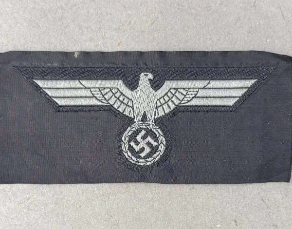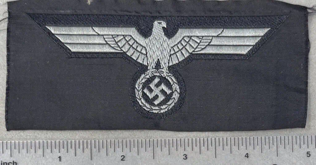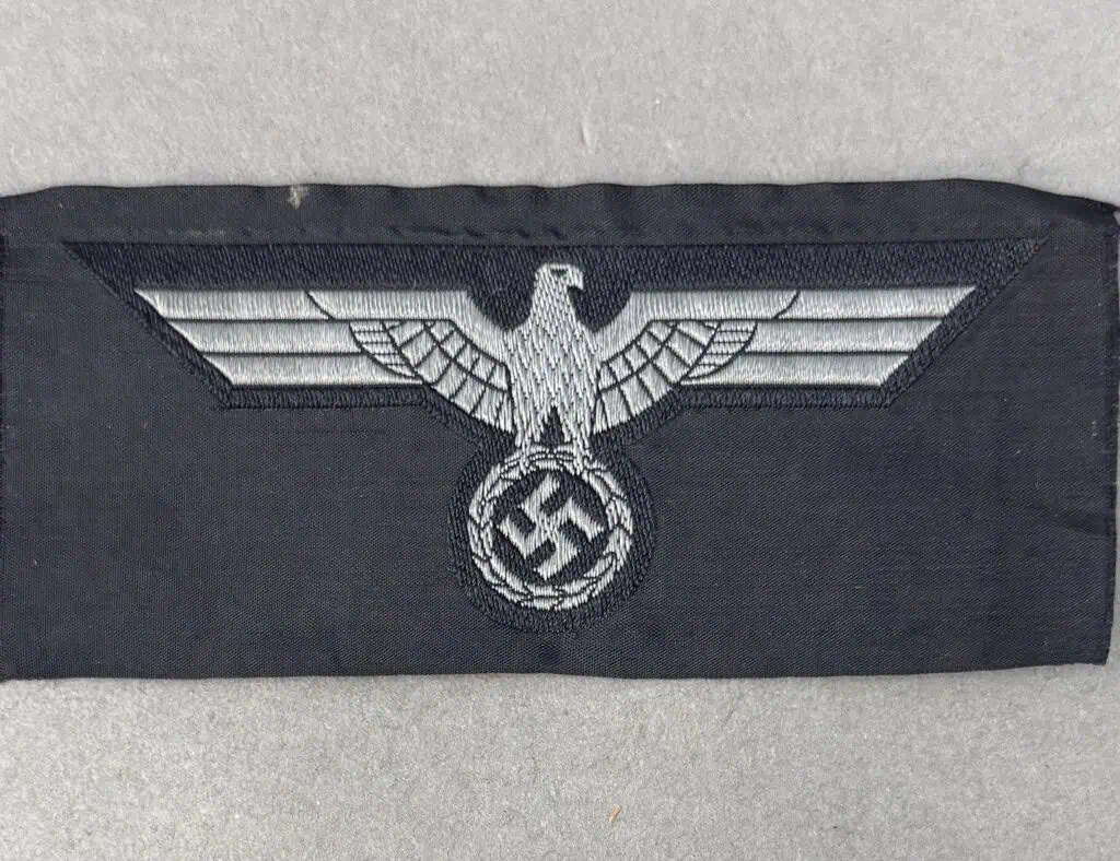 Original WWII German M39 Black Panzer Breast Eagle Brought Home By A U.S. Veteran Certified. German Army Panzer versions of the breast eagle on a black base to match the black panzer wrap uniform. , Later M39 pattern, machine woven national breast eagle with outstretched wings, clutching a wreathed, canted, swastika in it’s talons in gray rayon threads on a woven, black, rayon base. The eagles wingspan is roughly, 10cm from wing tip to wing tip. Nice example un-issued U.S. Veteran bring-back condition. Gettysburg Museum Certified (COA) provided. Rare 100% Guaranteed to be authentic. Sold for historic purposes only. See our other pieces on our web site. Also note when browsing our web site there are several pages of items, at the bottom of the list look for other page numbers. OUTSTANDING EXAMPLE! The M39 style is more rare than the earlier style!