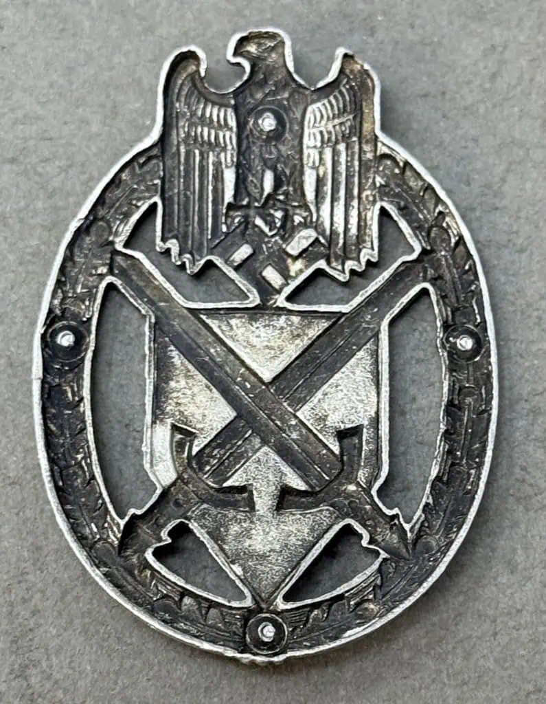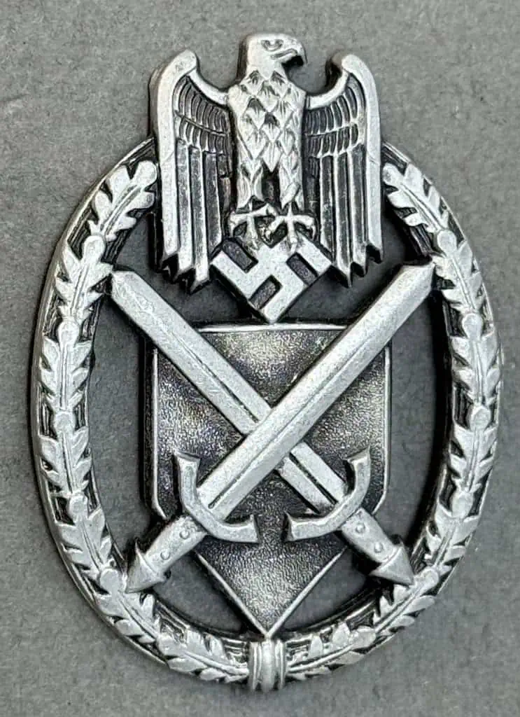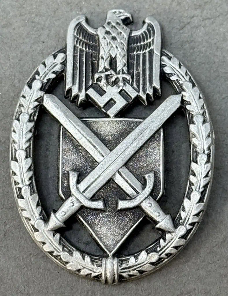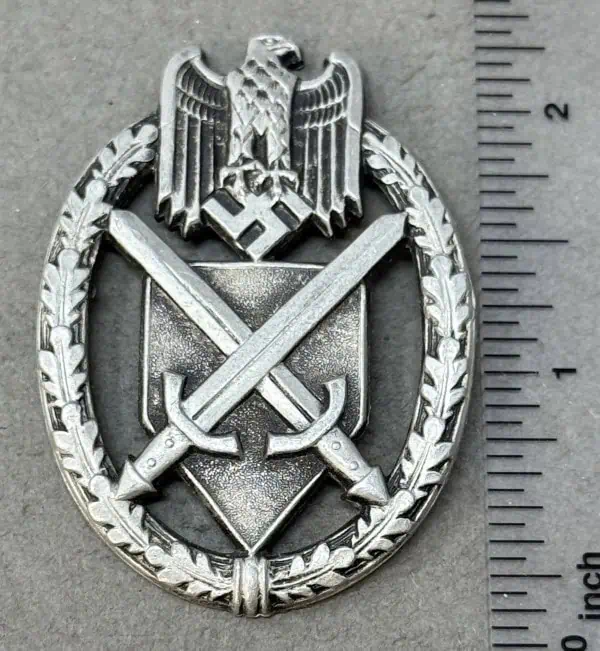 Original WWII German Marksman Lanyard Shield Brought Home By A U.S. Veteran Certified. Originally German army marksmen were distinguished by a series of sleeve stripes that were introduced on January 27TH 1928. These sleeve stripes remained in use until newly designed marksmen’s lanyards were introduced on June 29TH 1936. The lanyards were issued in twelve ascending grades with grade one being the lowest and grade twelve the highest. The grades were originally differentiated by a silver colored shield with a Wehrmacht eagle for grades one through four with an additional acorn device for each successive grade, a silver colored shield with a Wehrmacht eagle, crossed swords and a oak-leaf wreath for grades five through eight with an additional acorn device for each successive grade and a gilt colored shield with a Wehrmacht eagle, crossed swords and a oak-leaf wreath for grades nine through twelve with an additional acorn device for each successive grade. On January 9TH 1939 the first pattern lanyard shields for grades one through four were replaced with the silver-colored shield with a Wehrmacht eagle, crossed swords and a oak-leaf wreath that was slightly smaller than the first pattern shields for grades five through eight. The lanyards were awarded to qualifying EM/NCO’s and were accompanied with an award certificate. The lanyards were worn suspended from under the right shoulder strap and attached to the second top front closure button of most uniforms. Award of the marksmen’s lanyards was discontinued on February 14TH 1941 to be reinstituted at the successful conclusion of the war. Roughly, 55mm tall, 40mm wide, silver washed, stamped, zinc construction, second pattern, (circa January 1939-February 1941), national eagle shield for grades one to eight marksmen’s lanyards. The insignia consists of a vertically oval, embossed, oak-leaf wreath with a Wehrmacht style eagle with down swept wings, clutching a canted swastika in its talons, to the top center, encompassing crossed swords which are superimposed on a shield shaped base with a subtly pebbled background field. The reverse of the shield is a mirror image of the obverse and original 4 soldered, attachment prongs are no longer intact. The shield has lost all of its silver wash and has reverted to the flat, matte grey of the base alloy with small spots of light oxidization spotting. The shield has no visible manufacturer’s marks. Issued example in good condition. A nice, quality example. Gettysburg Museum Certified (COA) provided. Rare 100% Guaranteed to be authentic. Brought home by a U.S Veteran as a trophy of war. Sold for historic purposes only. See our other pieces on our web site. Also note when browsing our web site there are several pages of items, at the bottom of the list look for other page numbers. Do not miss this one! NICE EXAMPLE! RARE! Don’t Miss it!
