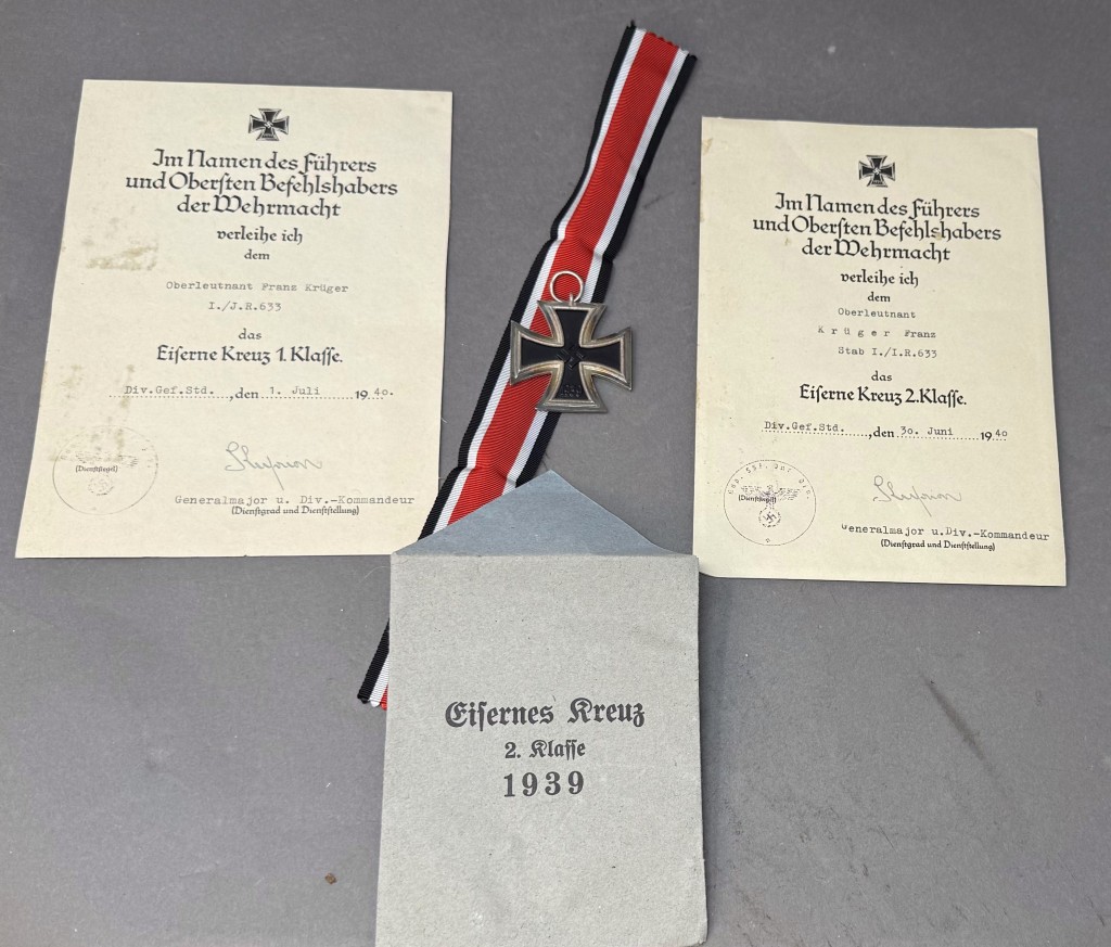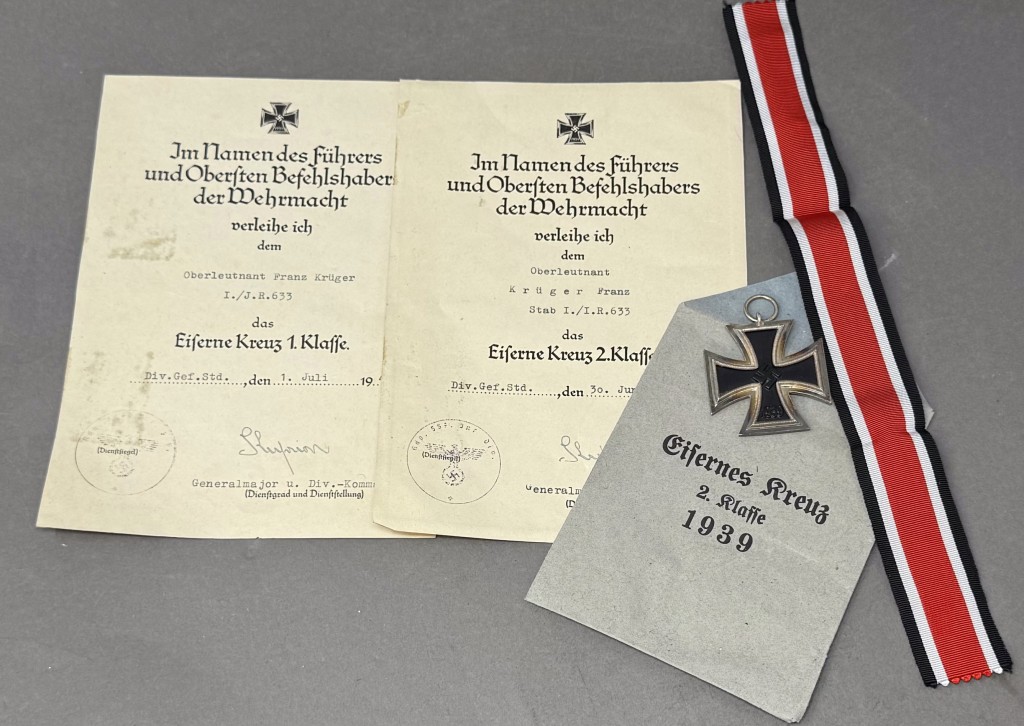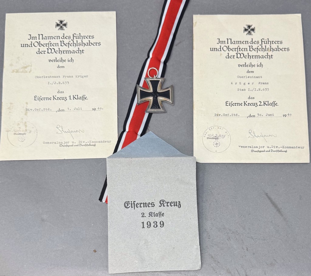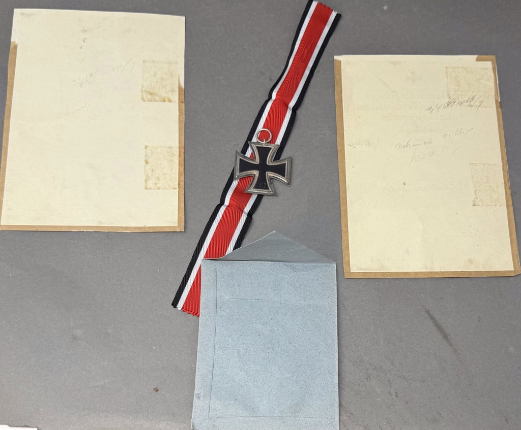 Original WWII German Iron Cross Second Class Medal With Original Issue Envelope, And Issue Document Plluse Iron Cross 1st Class Document to the same person. Classic WWII German Iron Cross. Eisernes Kreuz II Klasse or EK2. It was worn as shown in the photos on the day of presentation. After that the ribbon only was worn. This is one of the most iconic medals of Germany in both WWI and WWII.  Very good condition. It includes the ribbon and medal, envelope it came in and the Issue Document. Issue on June 30, 1940, to the same Army soldier. The EK1 was issued on July 1 1940 .100% Guaranteed to be authentic.  Complete museum documentation (COA) Provided. Please see our other German Medals and Relics From WWII.  Also note when browsing our web site there are several pages of items, at the bottom of the list look for other page numbers. RARE TO FIND ONE WITH IT’S ISSUE Document!! And 1st Class document!