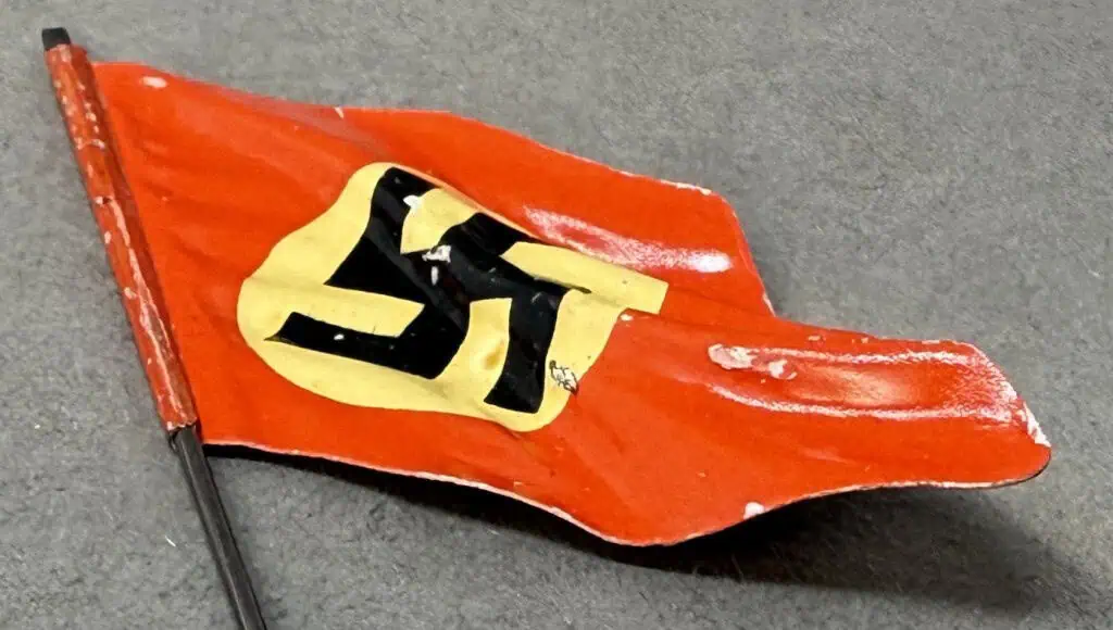 ORIGINAL WWII German NSDAP (NAZI) NATIONAL FLAG LINEOL Toy Soldier Painted Metal Flag Certified. Utilized by pretty much by all the organization of the Third Reich in one form or another. The swastika, (a Sanskrit word meaning “well-being”), is an ancient symbol that was utilized in numerous diverse cultures and signified both the cycle of life and the sun. The swastika was also a Nordic rune and the pagan Germanic symbol for Thor, God of Adventurers. In good condition HIGH QUALITY DOUBLE sided With pole very high quality. Original LINEOL toy soldier Nazi flag. Flag 23 mm by 18 mm, and 90 mm tall. Rare version. 100% Guaranteed to be authentic . A very desirable displayable size. Don’t miss this one! RARE in this size. Complete museum documentation (COA) Provided. Certified by The Gettysburg Museum of History. The Gettysburg Museum of History does not support or condone Adolf Hitler or the Nazi Party and is only offering this as a historic relic. Please see our other items. Also note when browsing our web site there are several pages of items, at the bottom of the list look for other page numbers. Has a very 3-D look like it’s blowing in the wind! Don’t miss it!