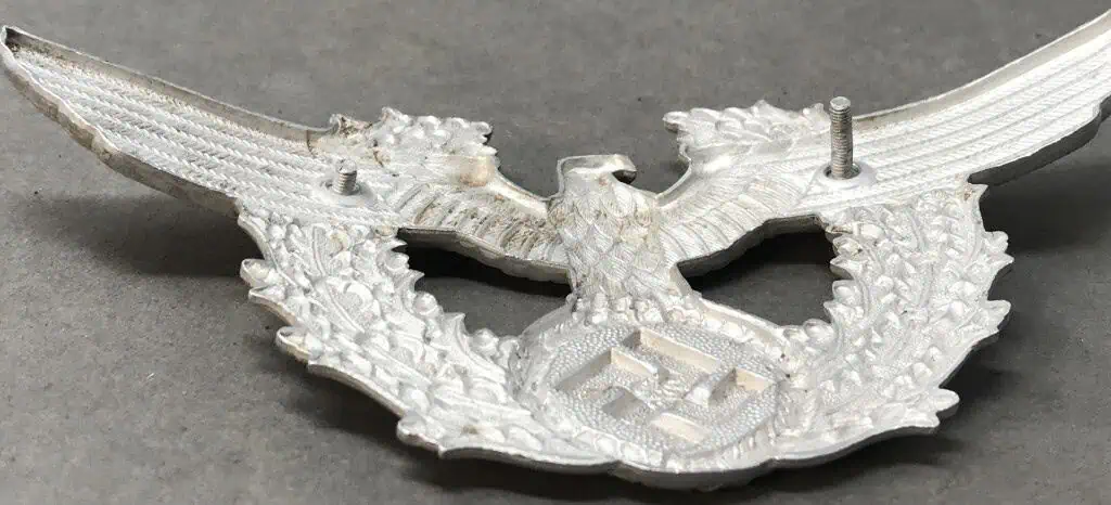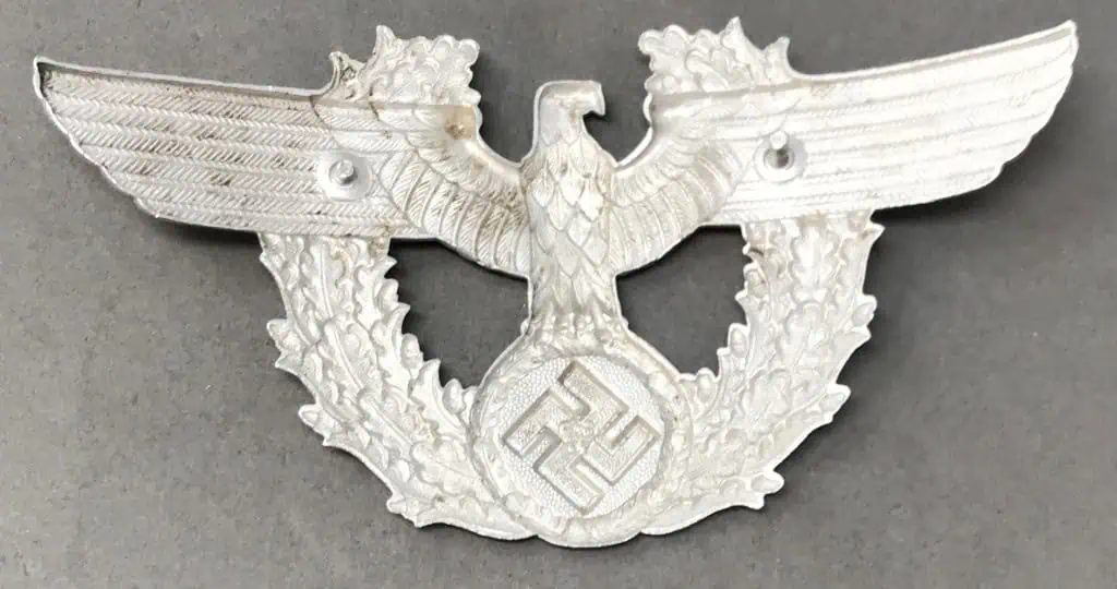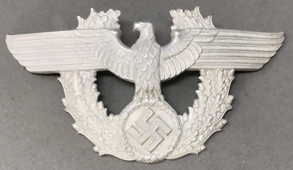 Original WWII German Police POLIZEI NCO’S SHAKO EAGLE. (Tschako Adler) . Dress regulations introduced a slightly modified version of the Shako for wear by all civil police personnel with minor variations. When worn the Shako was outfitted with a new style national eagle and swastika. Of Note: The first pattern police eagle and swastika was originally introduced on April 23RD 1934 and a slightly modified, second pattern, police eagle and swastika was introduced on June 25TH 1936 to replace the first pattern. Second pattern, (Circa June 1936-May 1945), single piece, silver washed, die stamped zinc alloy, construction, right facing eagle features out-stretched wings, clutching a wreathed, canted swastika in it’s talons and is superimposed on a vertically oval, opened top, oak-leaf wreath with the eagles wings extending beyond the outer edges of the wreath. The hollow backed reverse is a mirror image of the obverse and has one of the two inset, soldered, screw threaded attachment prongs, still has the attachment bolts! Nicely maker marked. Gettysburg Museum Certified (COA) provided. 100% Guaranteed to be authentic. Sold for historic purposes only. See our other pieces on our web site. Also note when browsing our web site there are several pages of items, at the bottom of the list look for other page numbers. DO NOT MISS IT! GREAT LOOKING VERY BIG EAGLE!